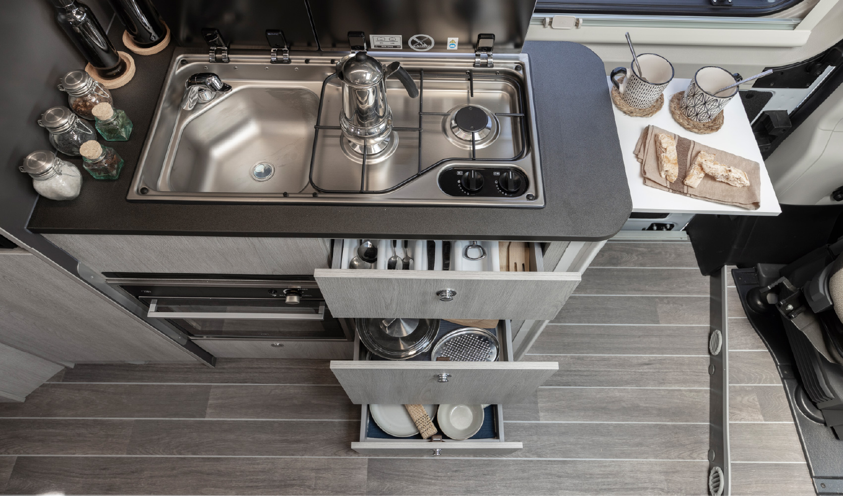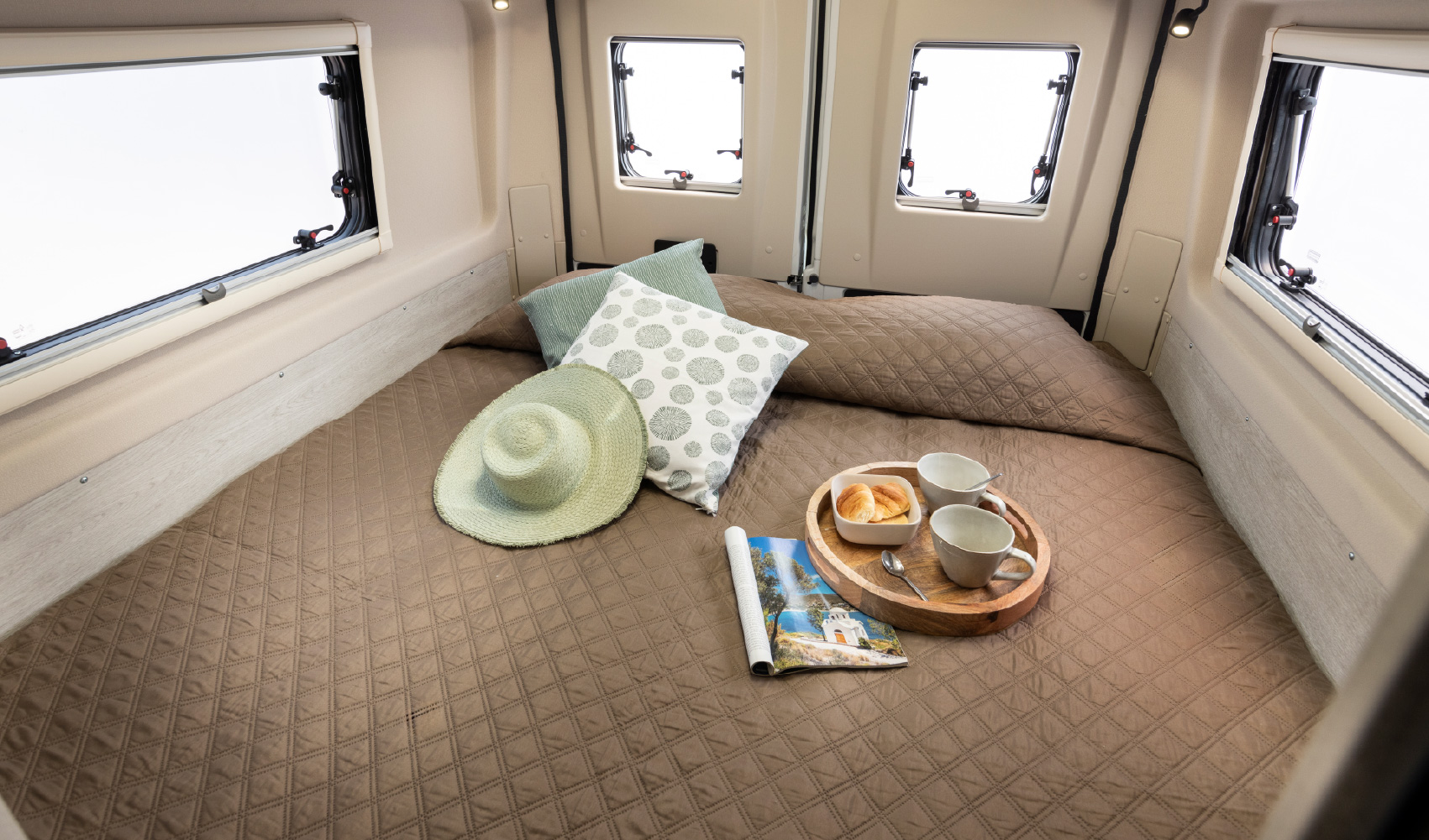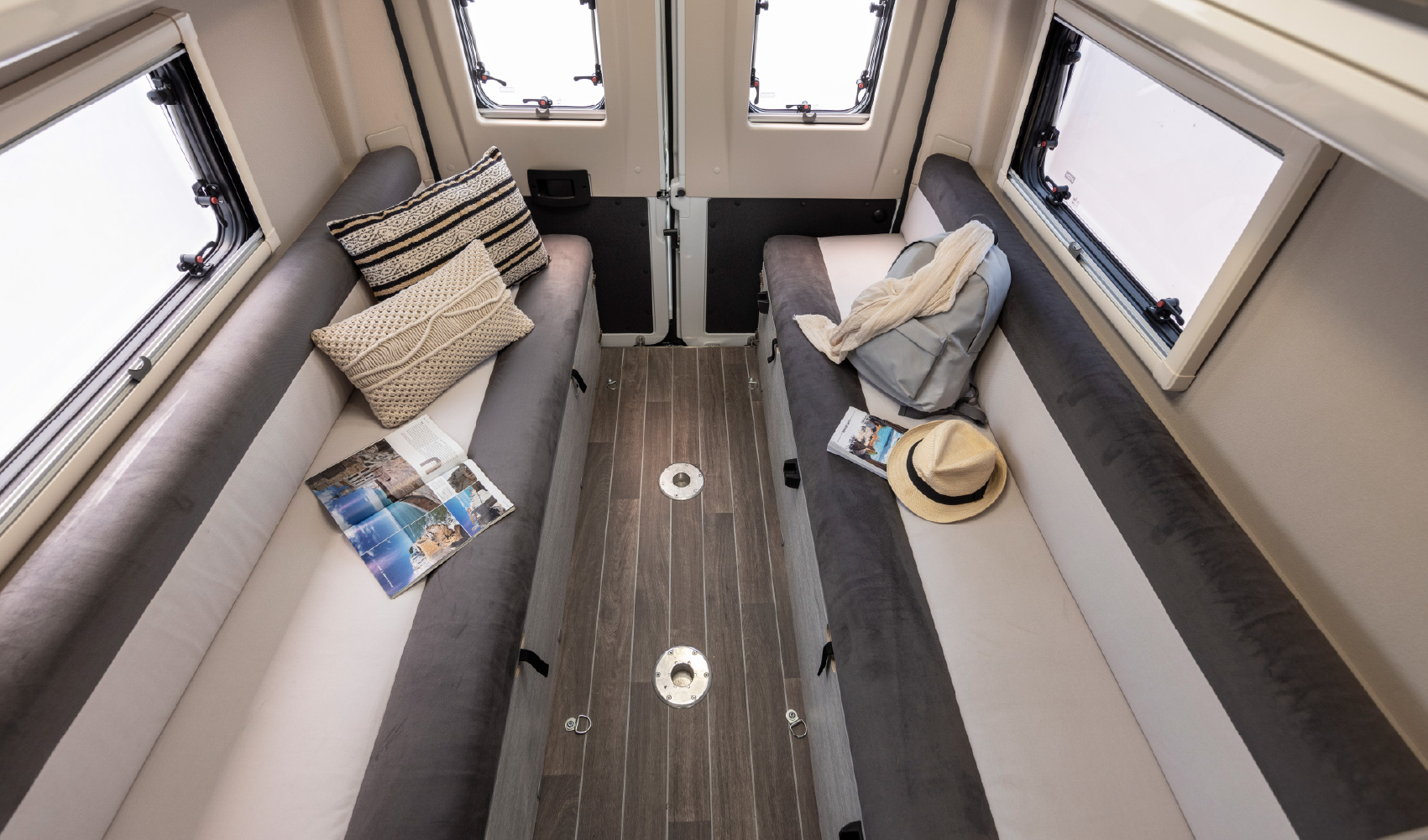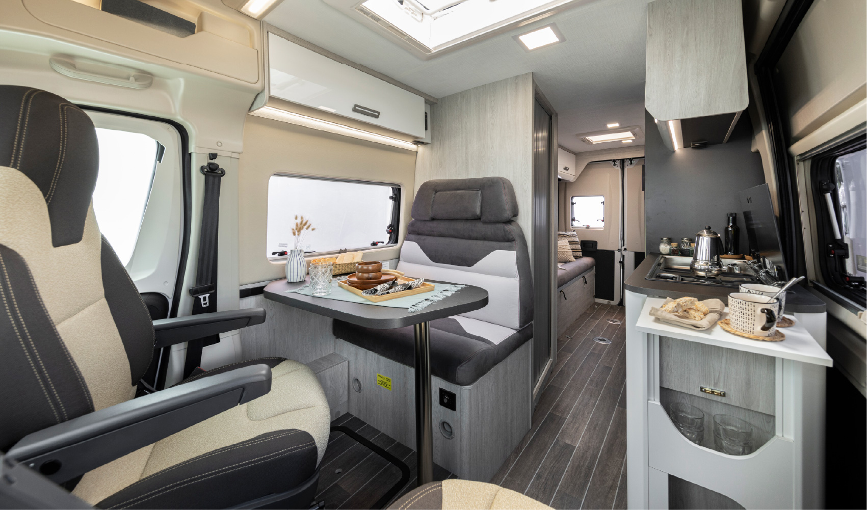 Inside, the Livingstone range is cleverly designed to make the most of every inch of space. You’ll find fully equipped kitchens with integrated hobs and fridges, flexible sleeping areas for two to four people and compact bathrooms with integrated showers. The interiors are finished with a clean, modern Italian style, giving the space a premium feel while remaining practical for real-world use.