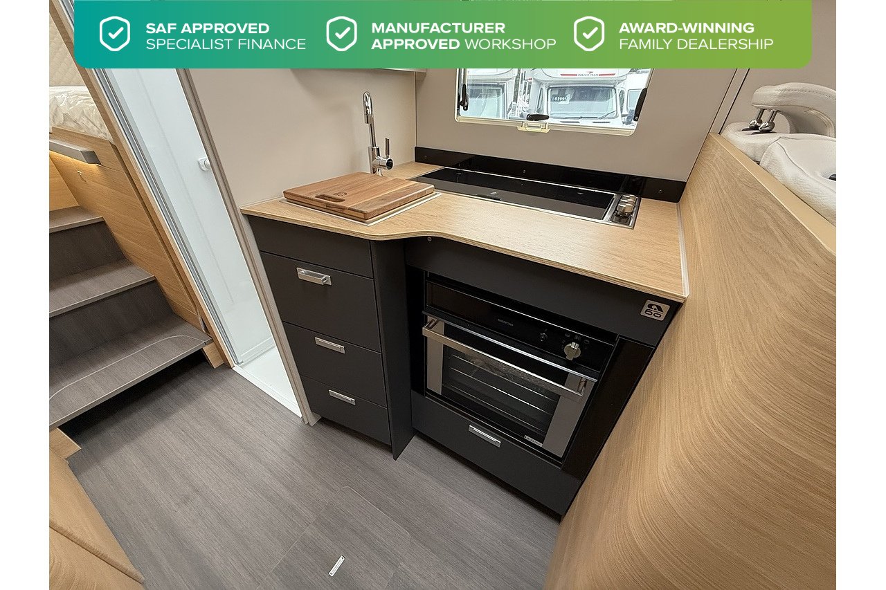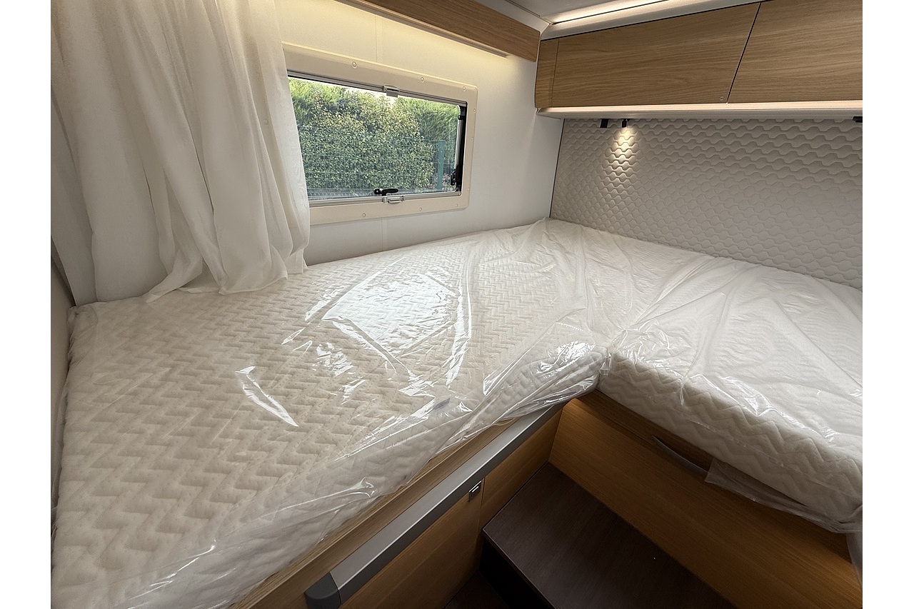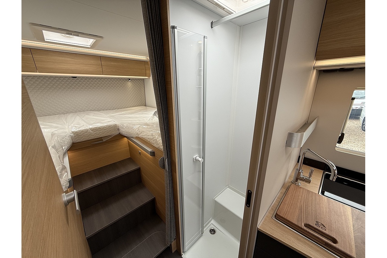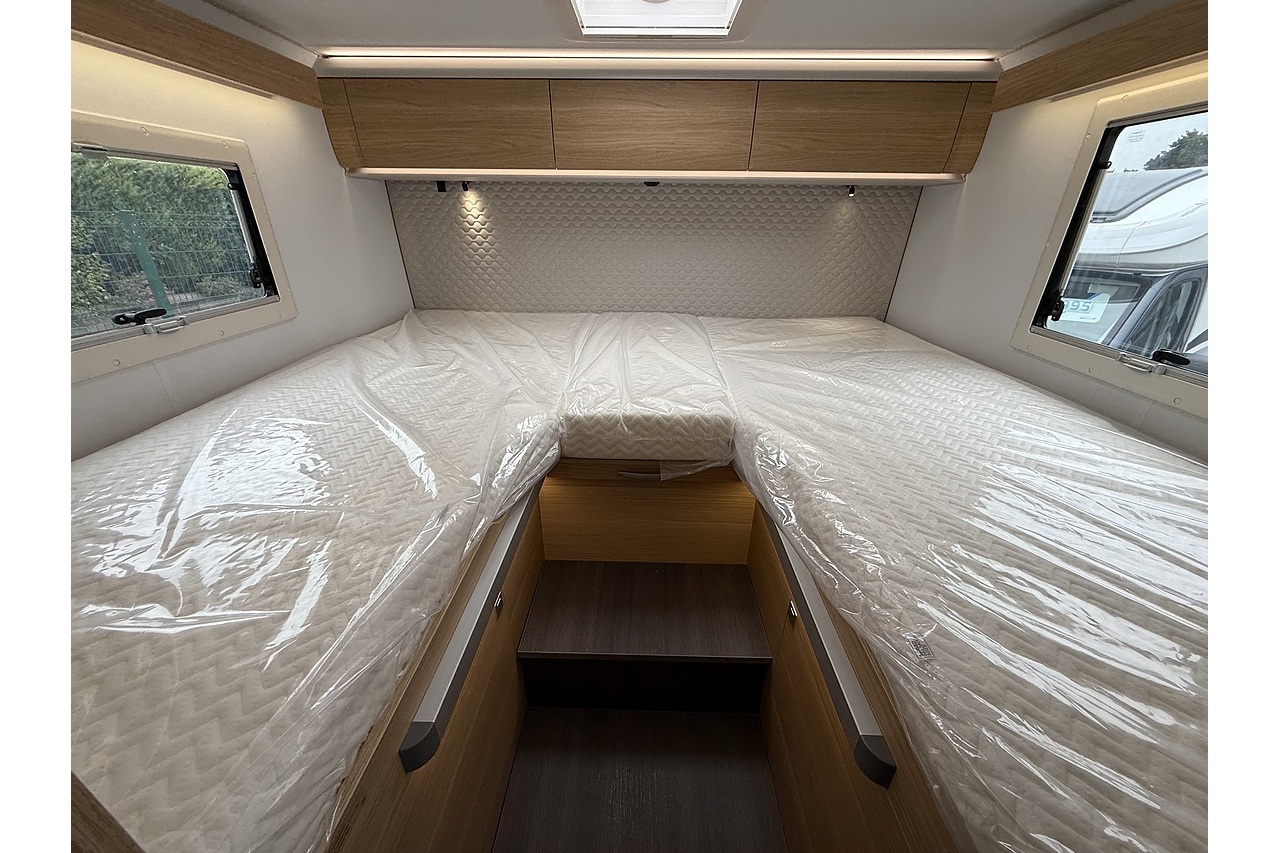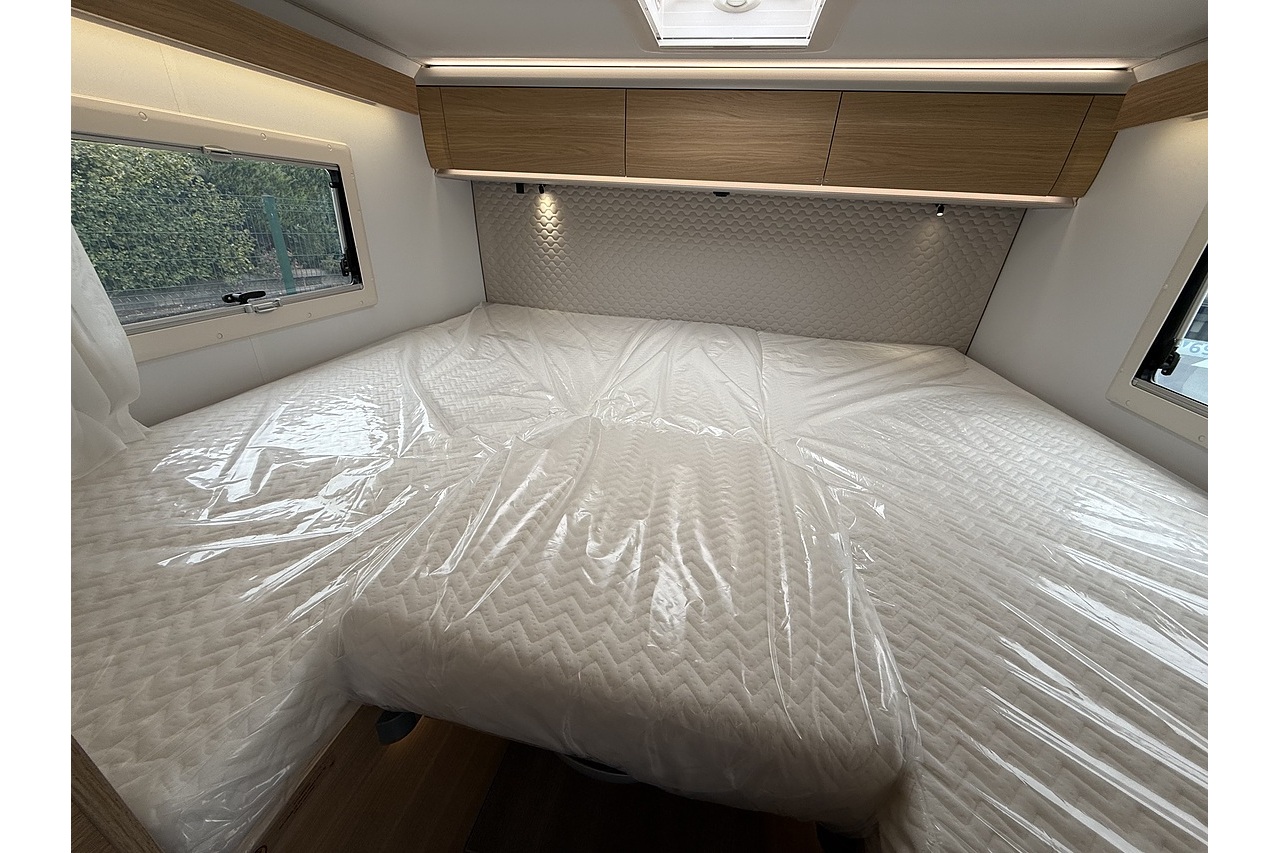 Comfortable Sleeping Arrangements – Twin single beds at the rear (convertible into a large double) and an electric drop-down bed over the lounge for extra sleeping capacity.