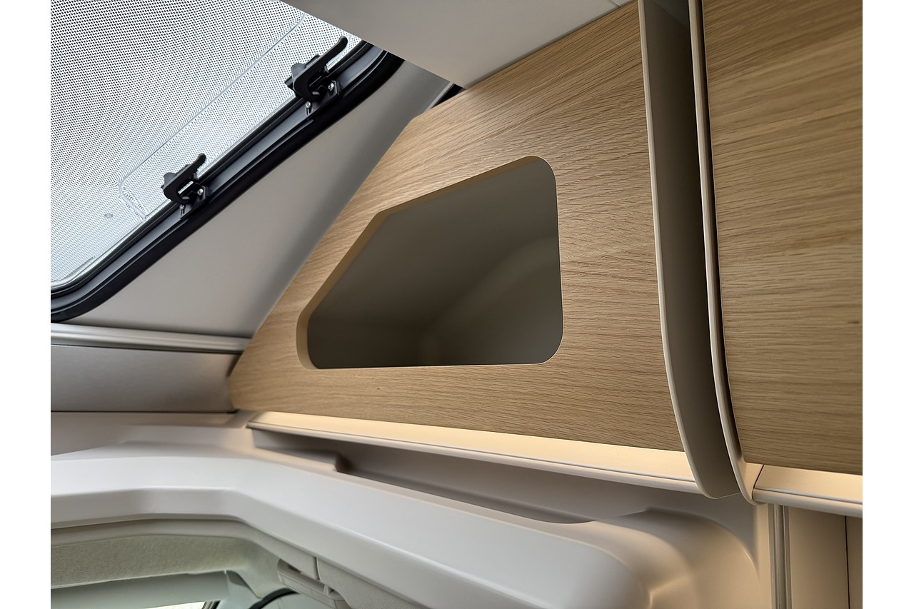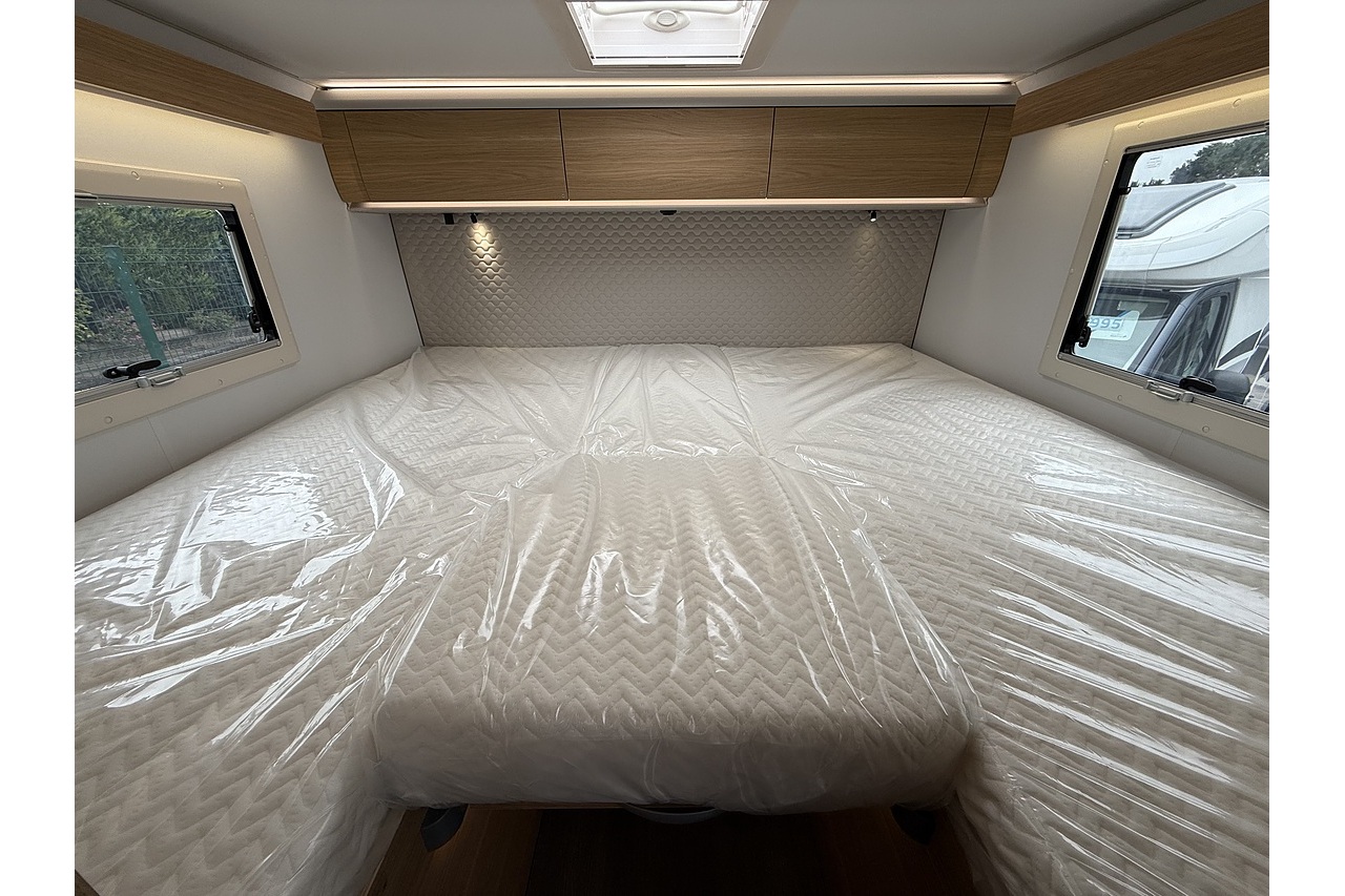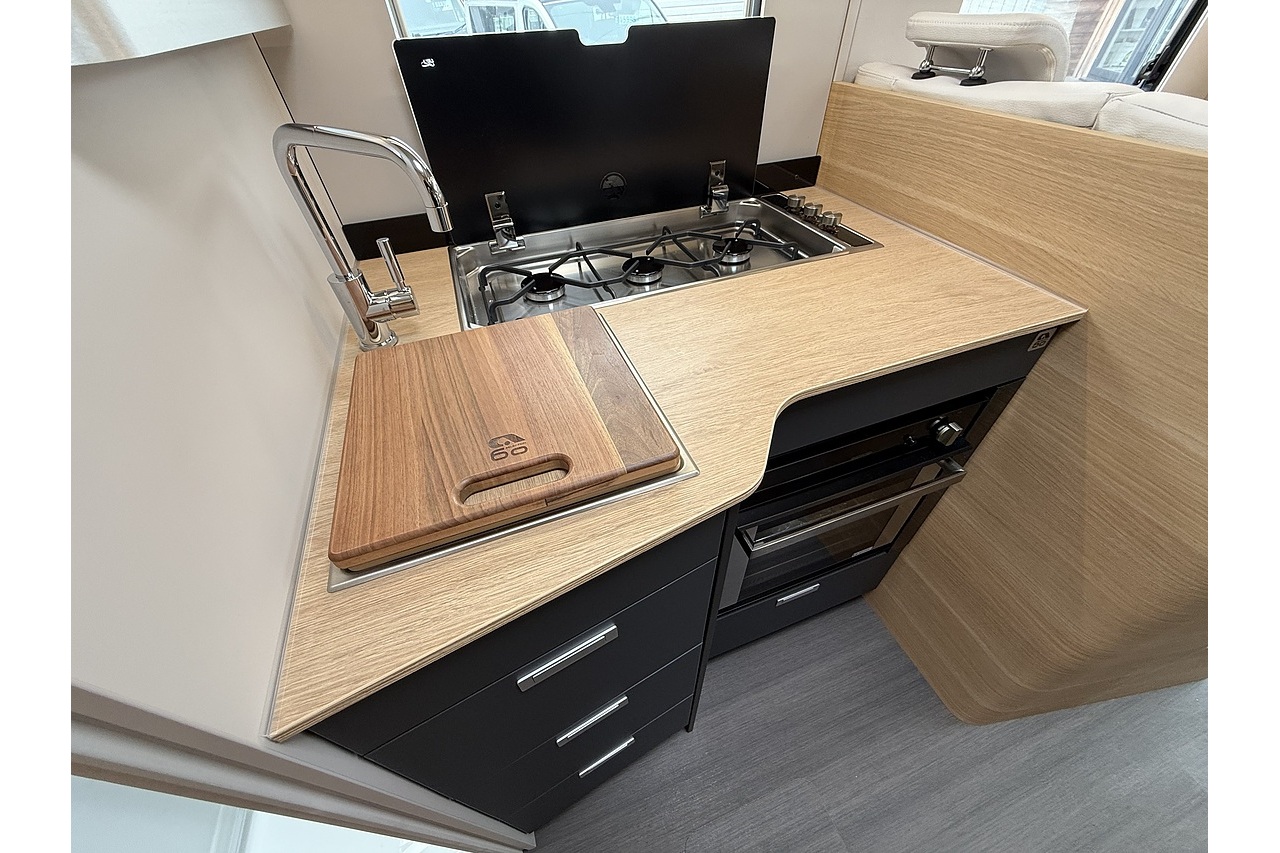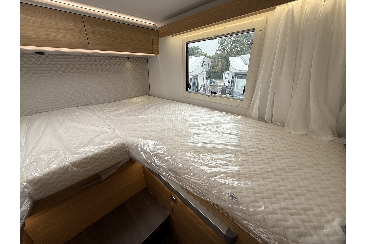 Comfortable Sleeping Arrangements – Twin single beds at the rear (convertible into a large double) and an electric drop-down bed over the lounge for extra sleeping capacity.