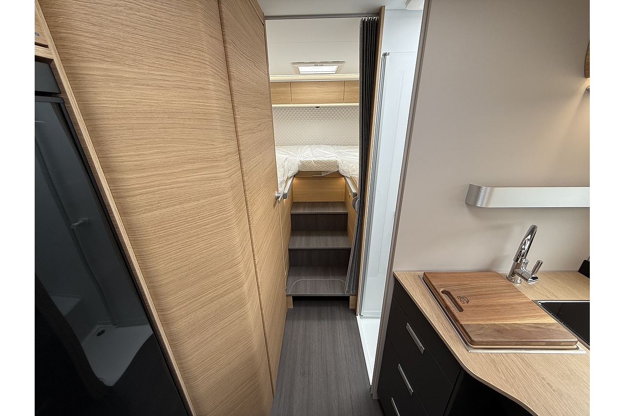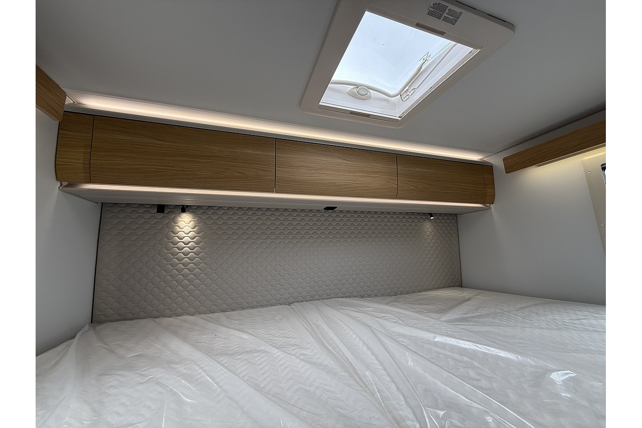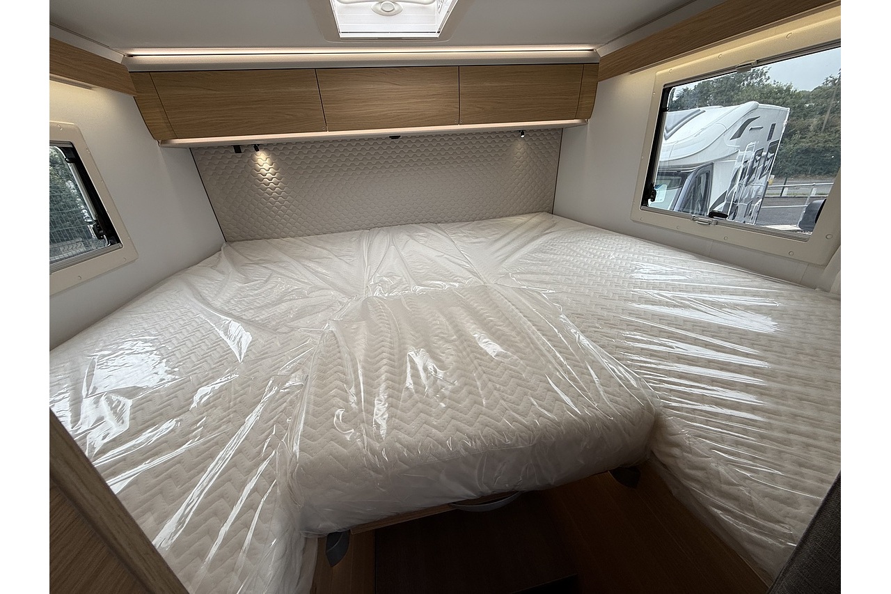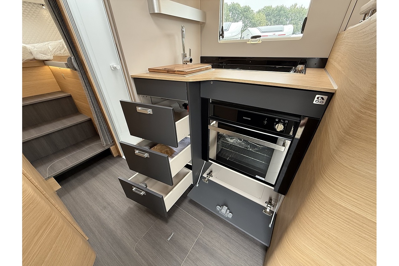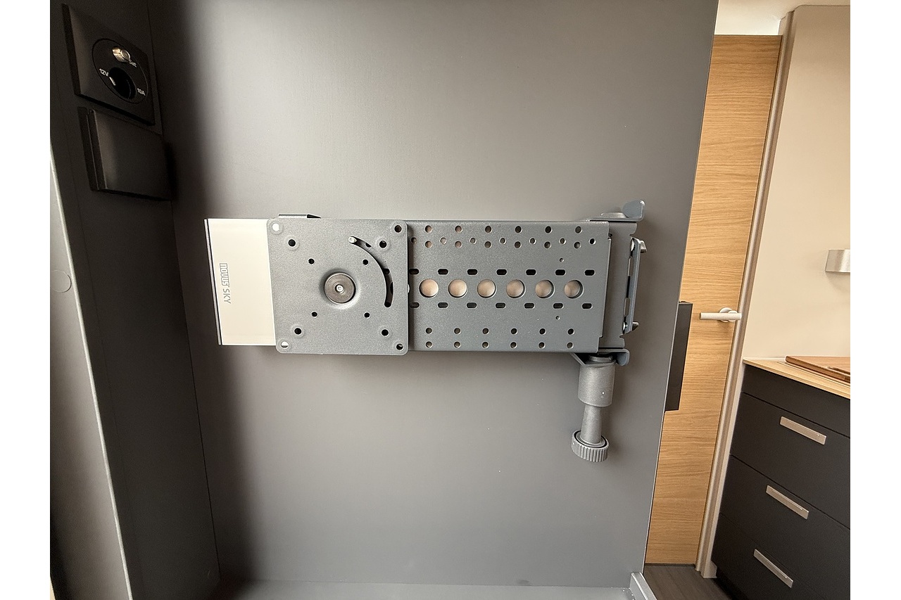 Comfortable Sleeping Arrangements – Twin single beds at the rear (convertible into a large double) and an electric drop-down bed over the lounge for extra sleeping capacity.