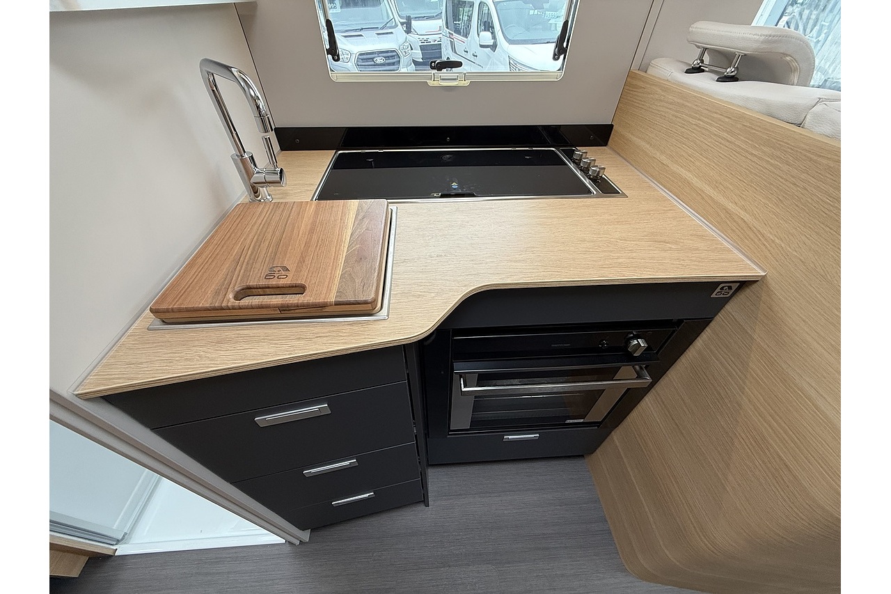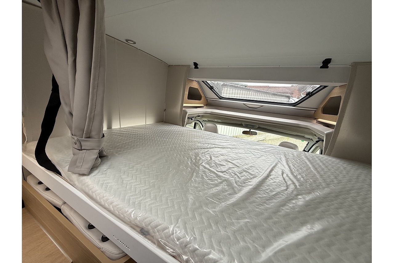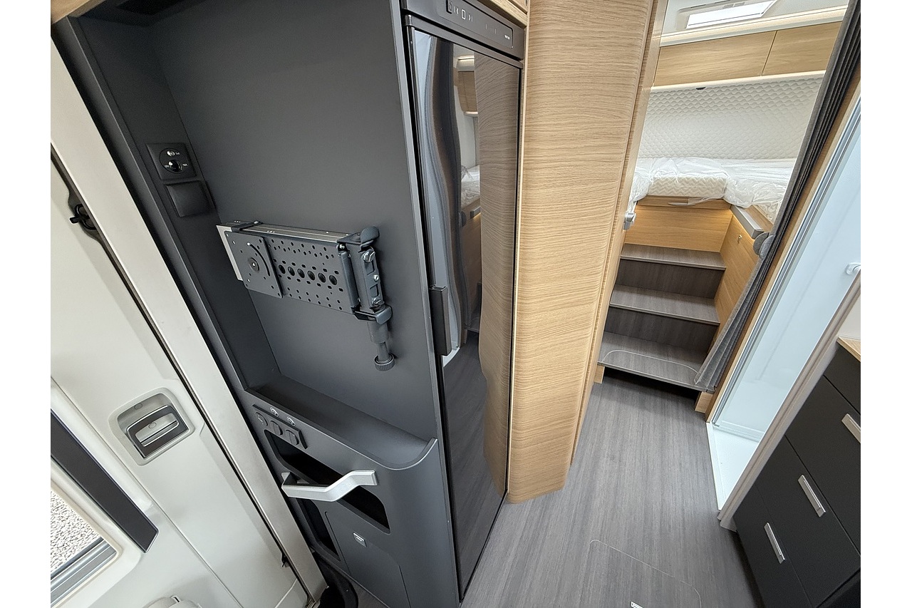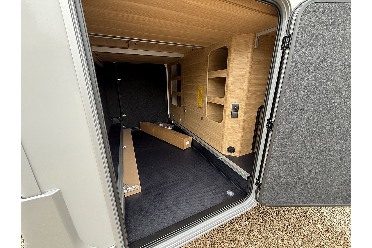 Comfortable Sleeping Arrangements – Twin single beds at the rear (convertible into a large double) and an electric drop-down bed over the lounge for extra sleeping capacity.