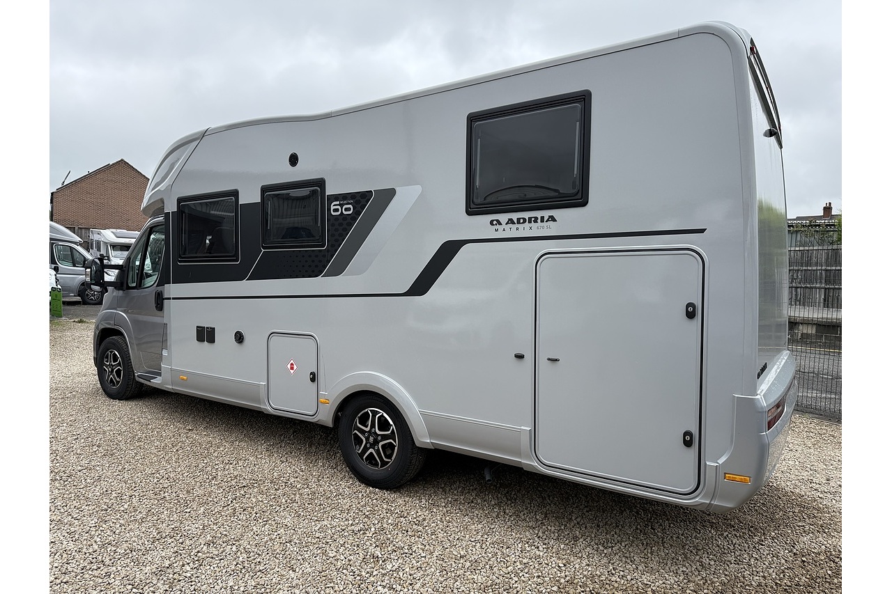 Celebrate 60 years of Adria excellence with the new Adria Matrix 670 SL 60th Anniversary Edition. This limited-edition motorhome combines sleek modern design, premium features, and innovative technology to offer a truly luxurious travel experience. Built on the latest Fiat Ducato chassis, it delivers a smooth and efficient drive, perfect for any journey.