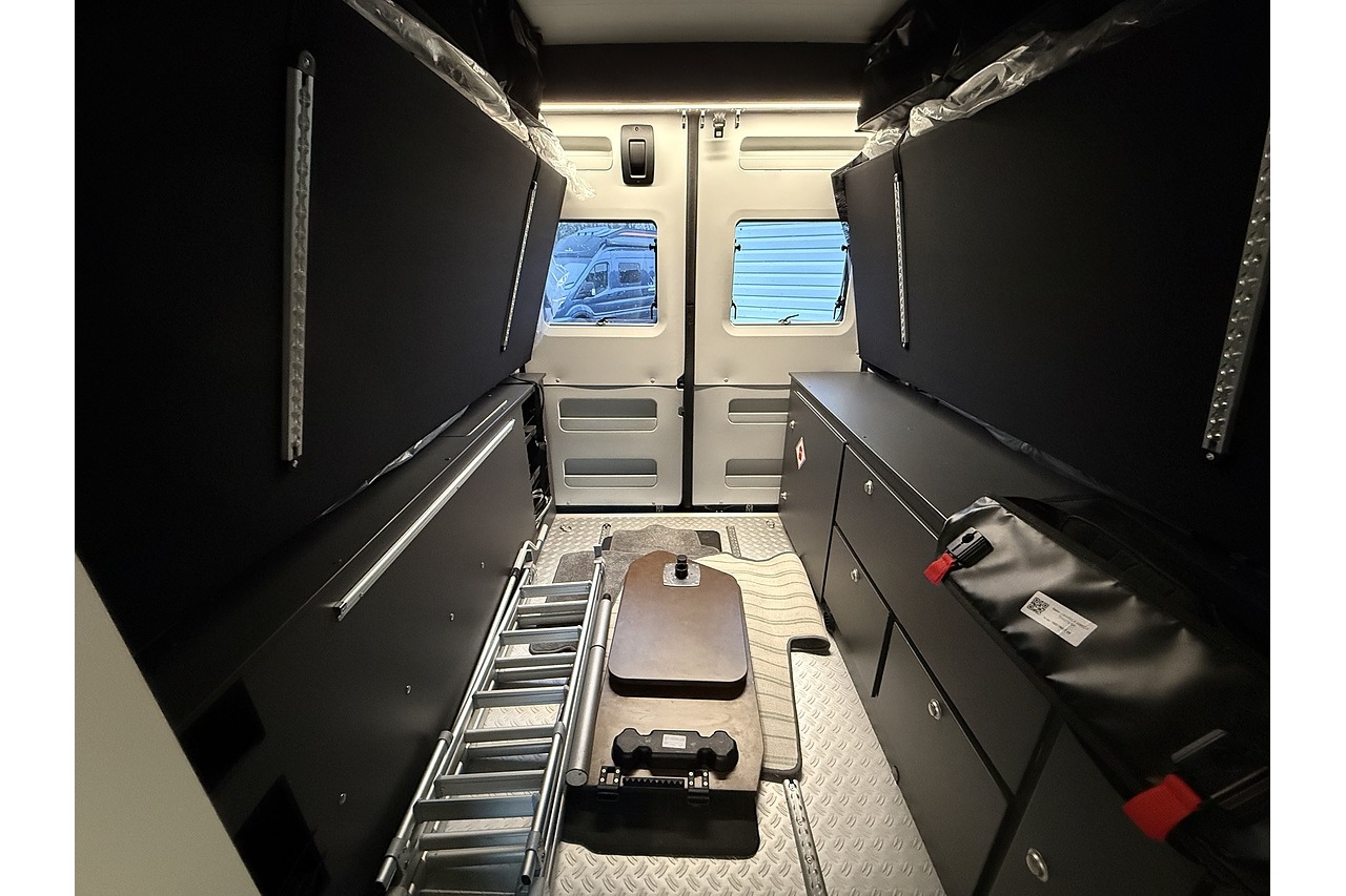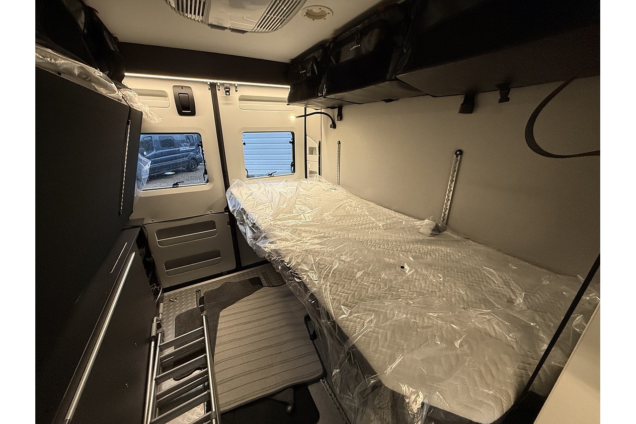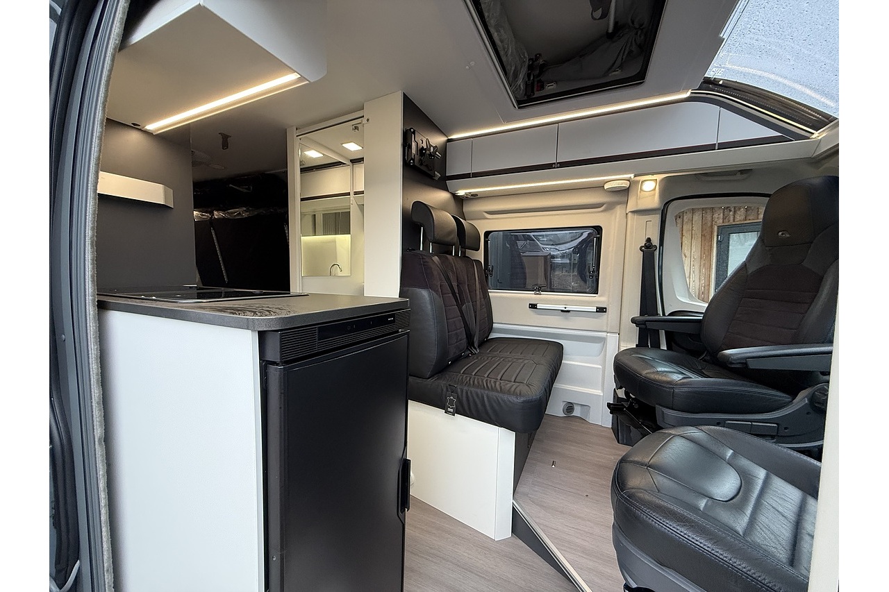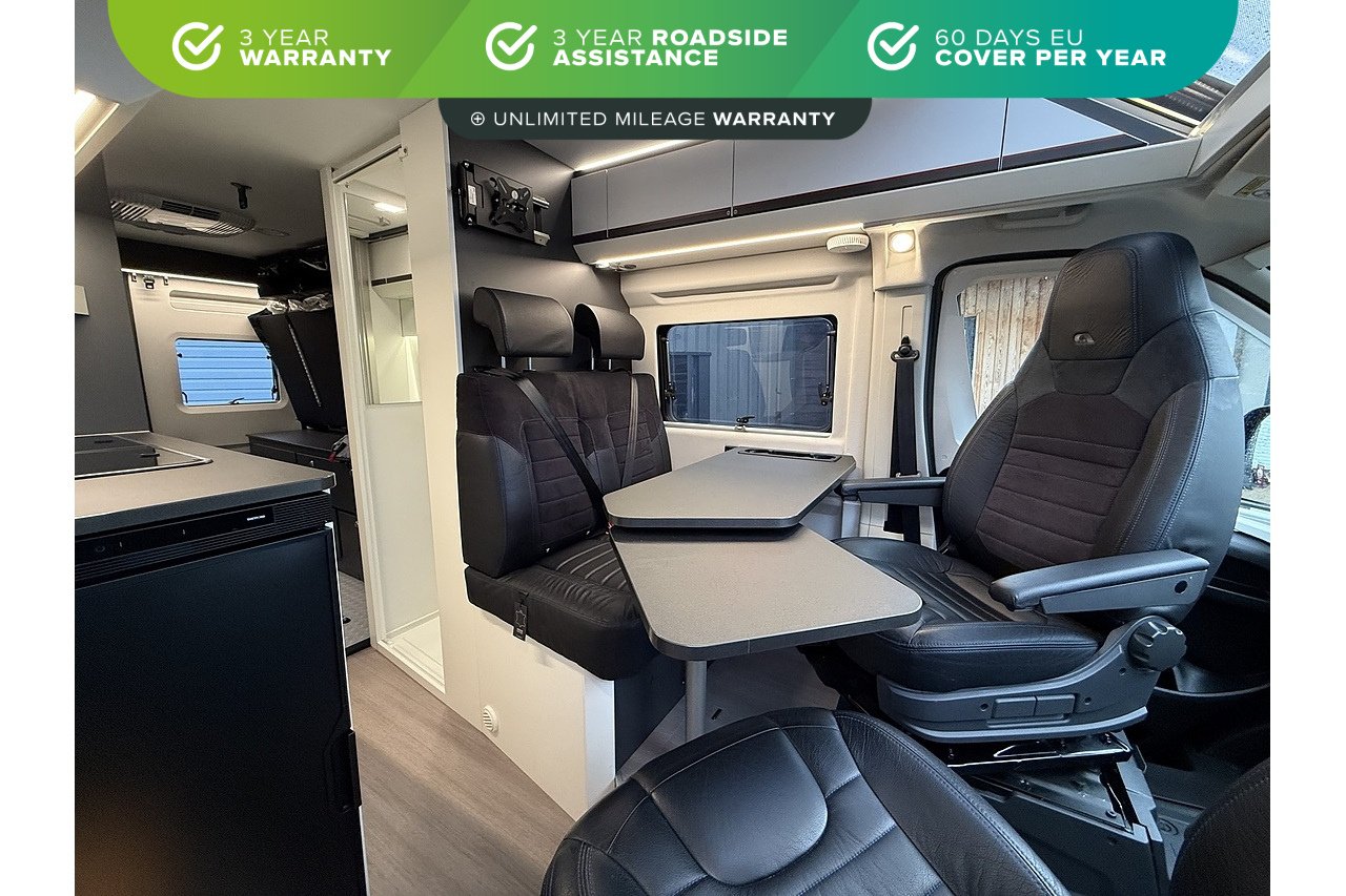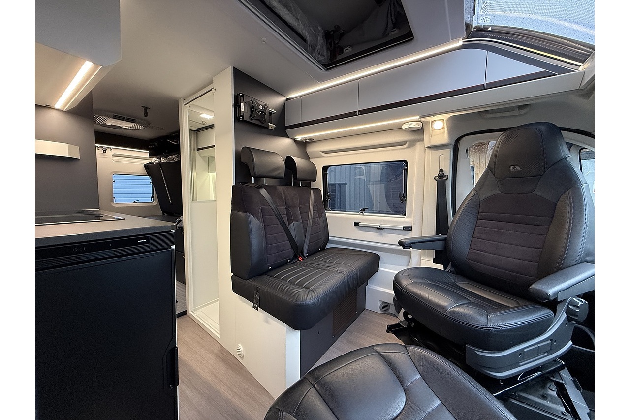 Swivel cab seats, adjustable dining table, LED lighting throughout