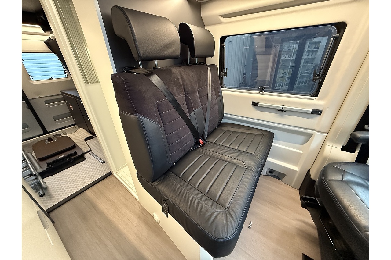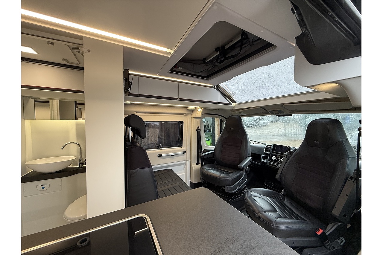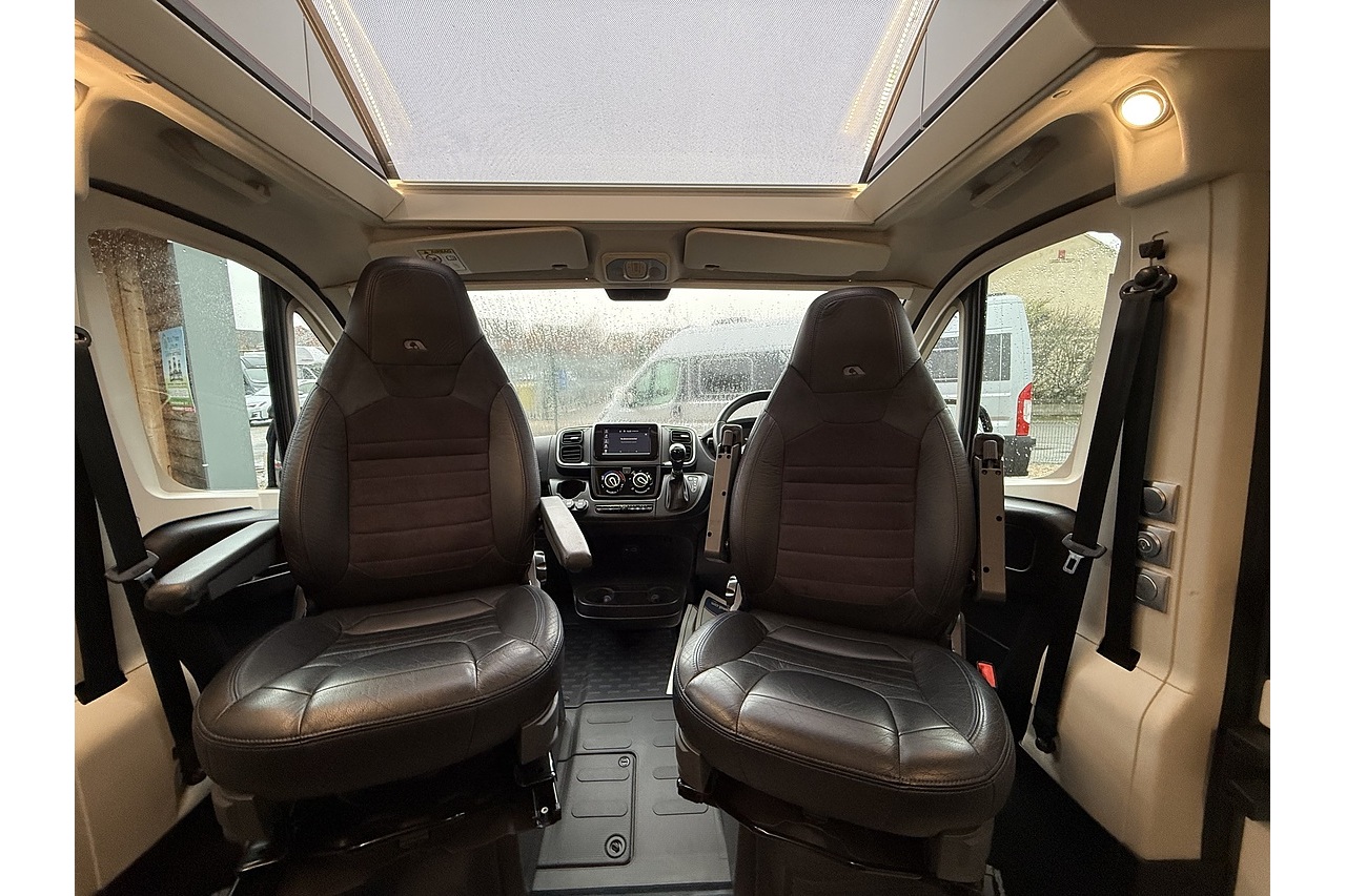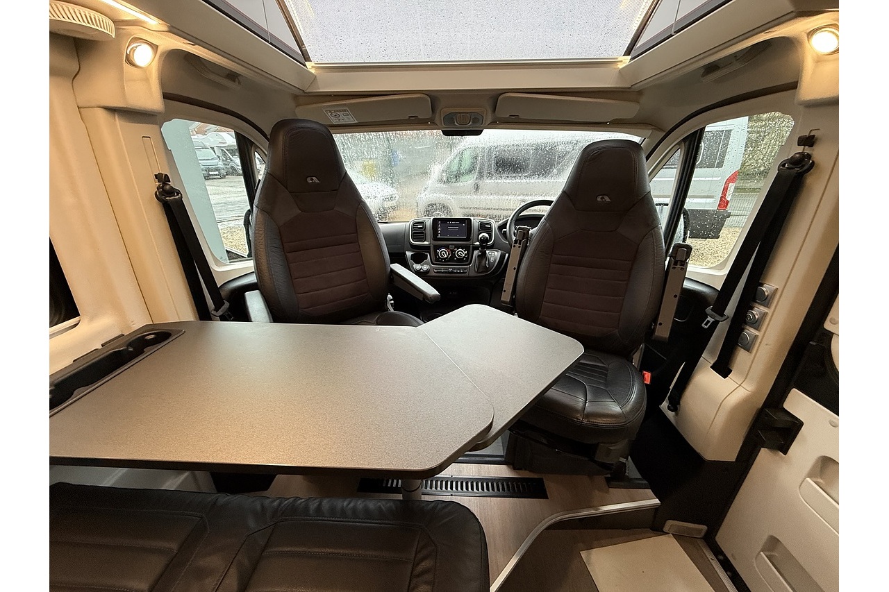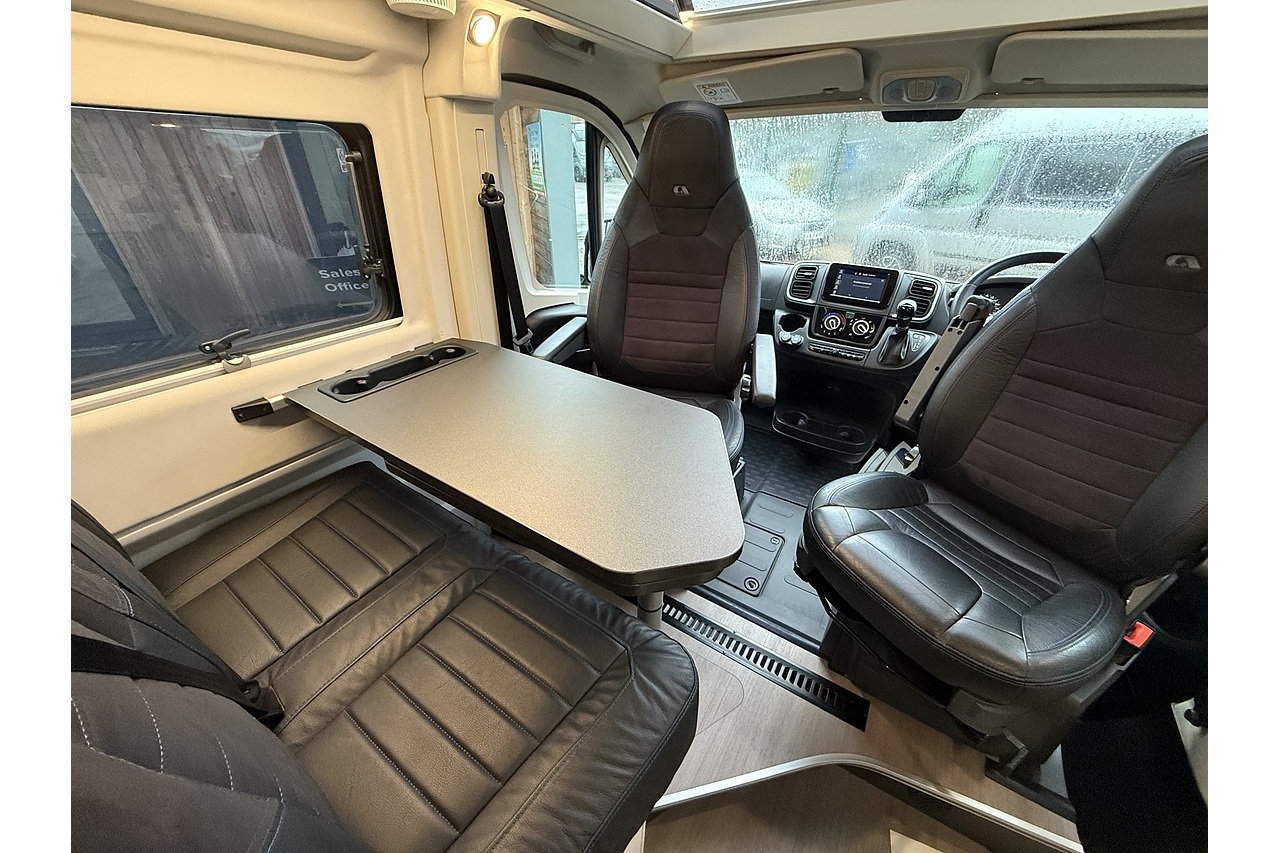 The innovative Adria Twin Sports 640 SG layout features a large rear garage area—ideal for bikes, boards, or sports equipment—along with a versatile rear sleeping setup perfect for active travellers. Up front, the dinette and swivel captain’s seats create a comfortable lounge and dining area.