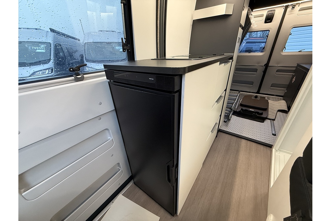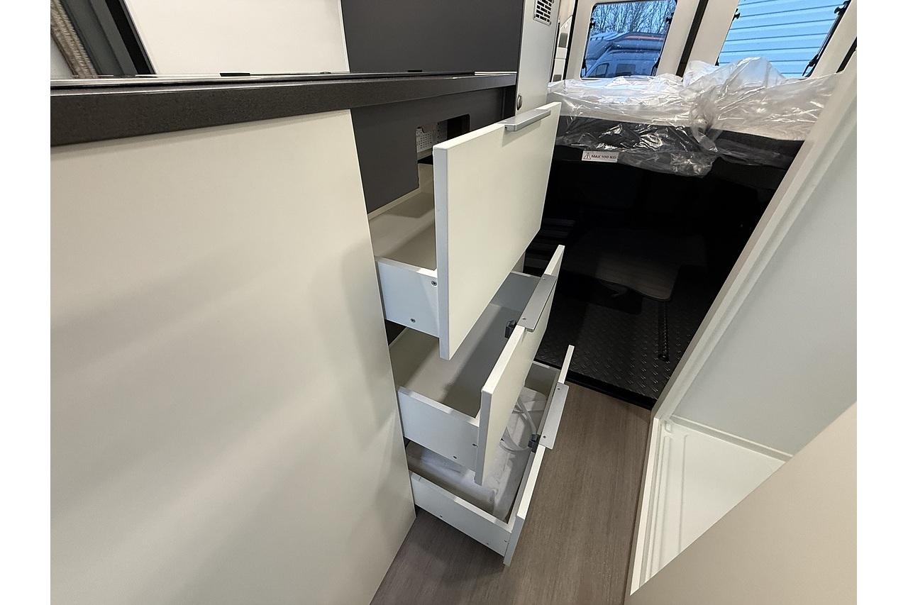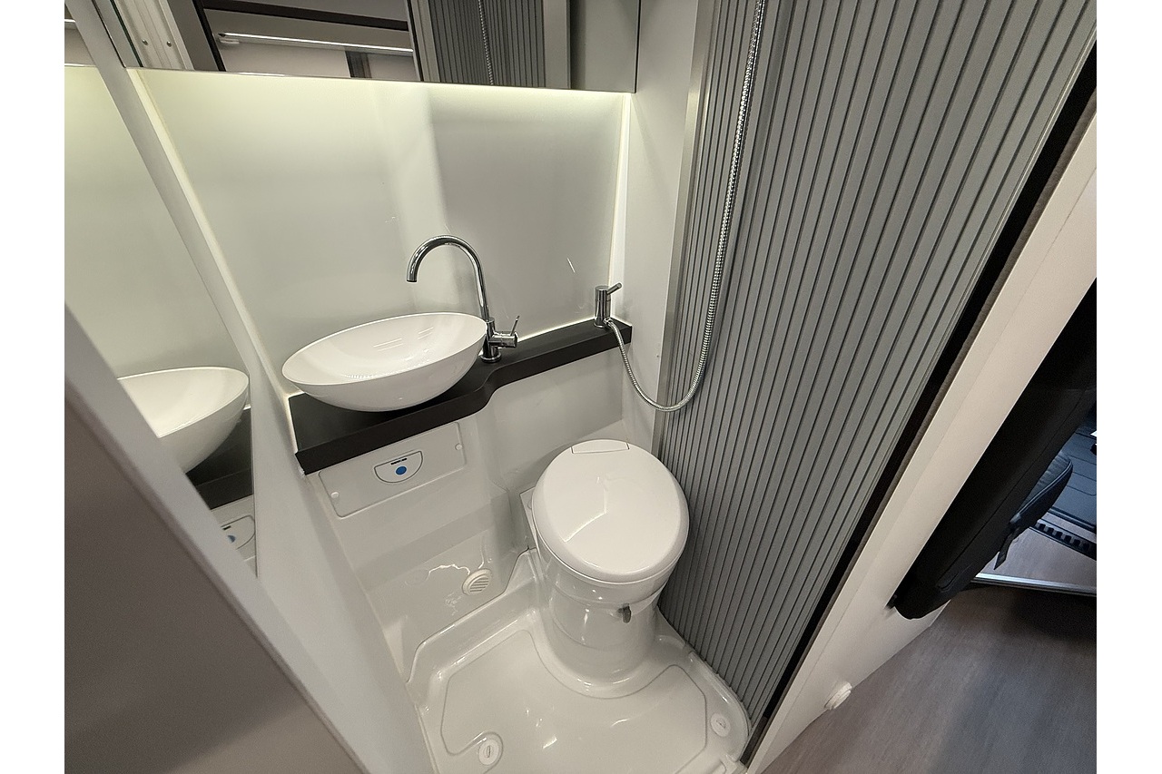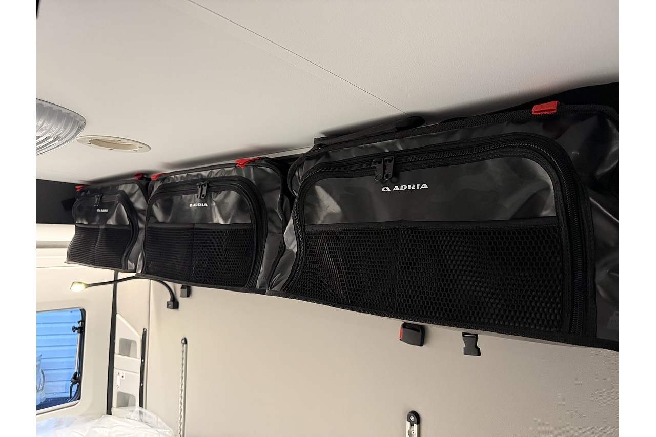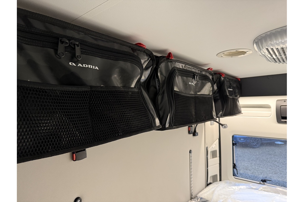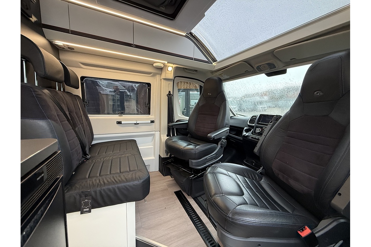 The innovative Adria Twin Sports 640 SG layout features a large rear garage area—ideal for bikes, boards, or sports equipment—along with a versatile rear sleeping setup perfect for active travellers. Up front, the dinette and swivel captain’s seats create a comfortable lounge and dining area.