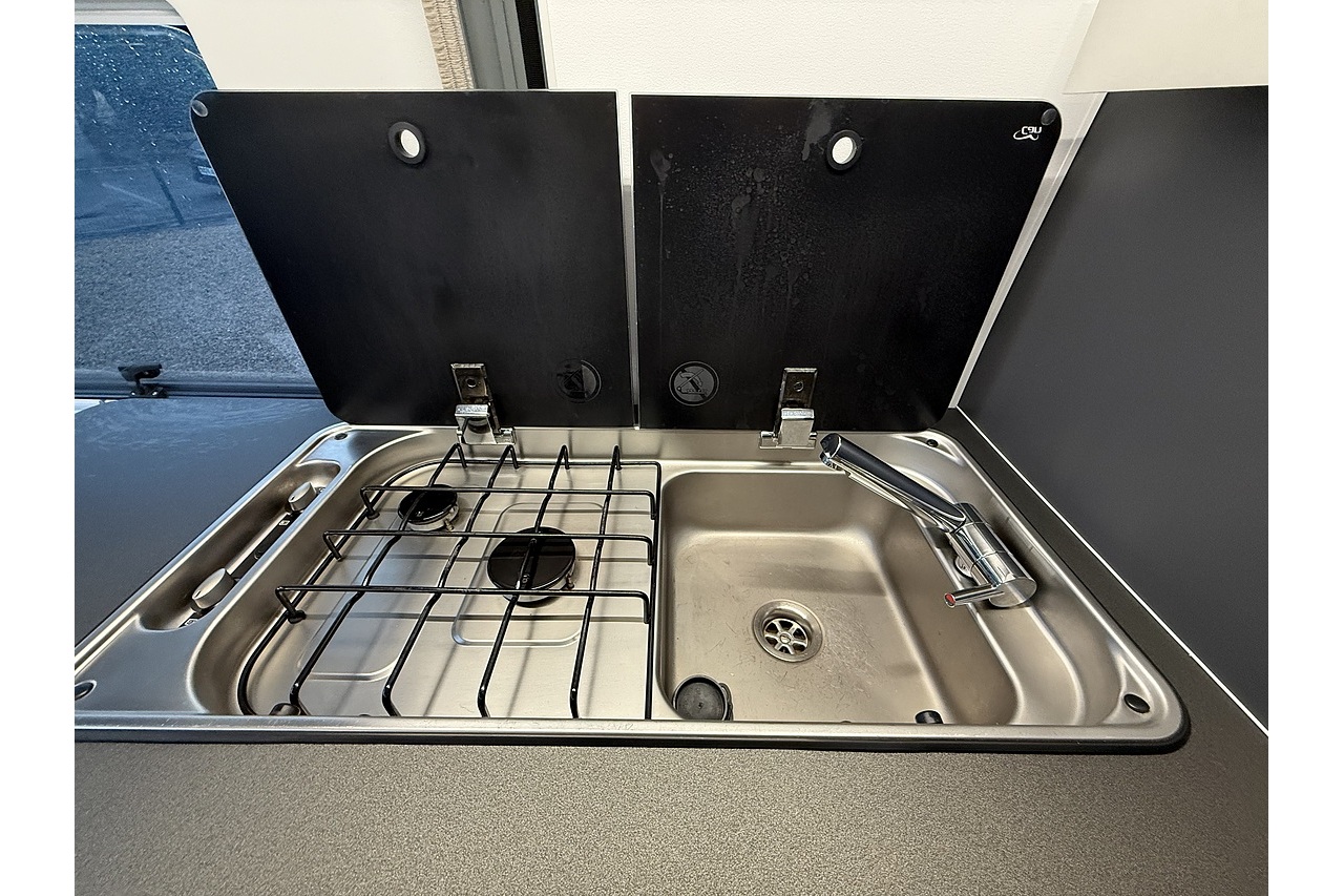 Fully equipped kitchen with 2-burner hob, sink, and fridge