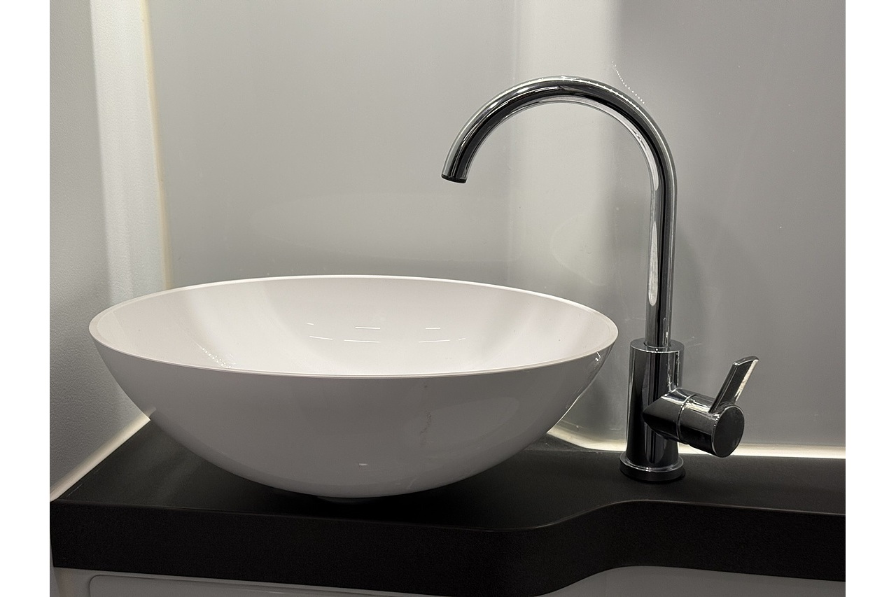 Modern washroom with shower, toilet, and sliding sink design