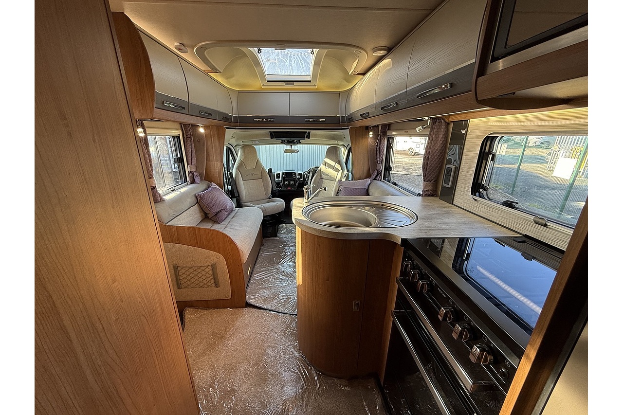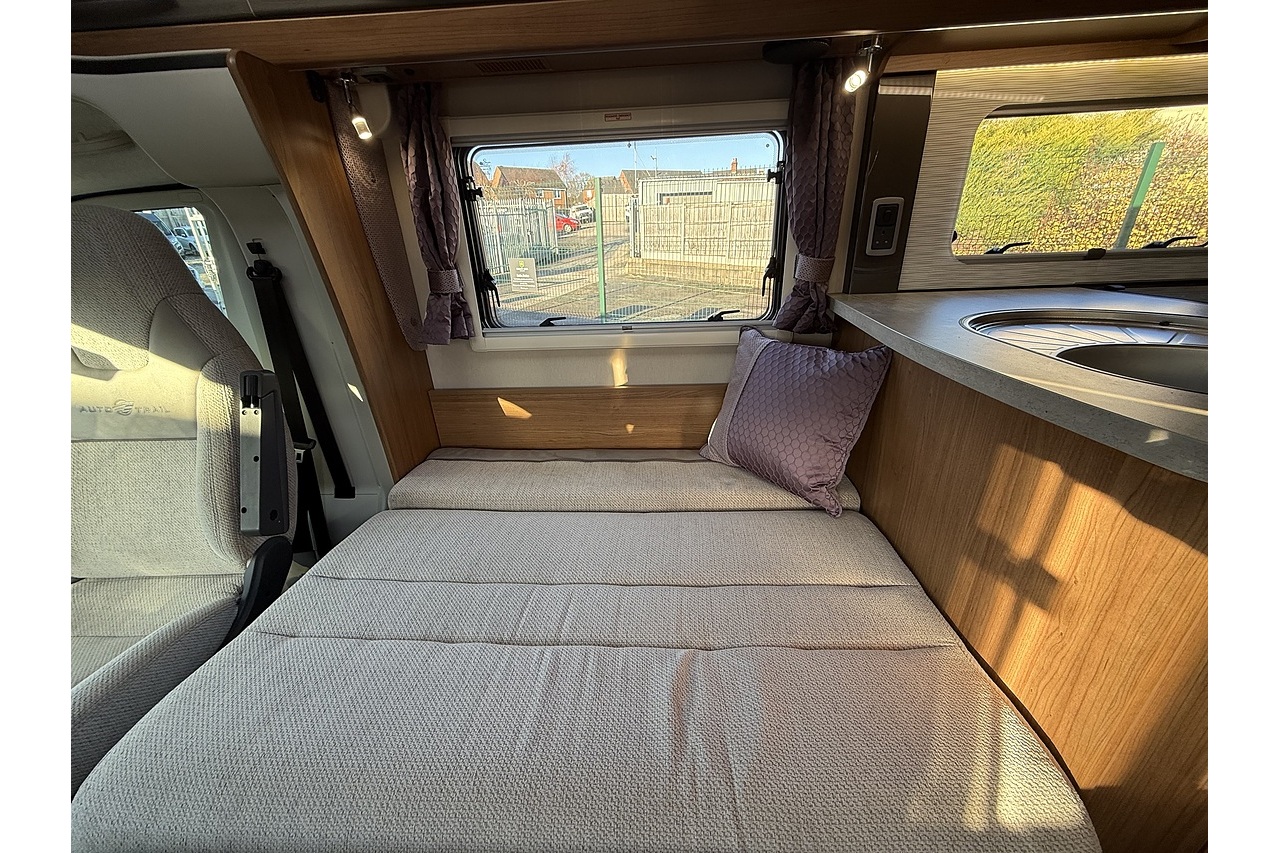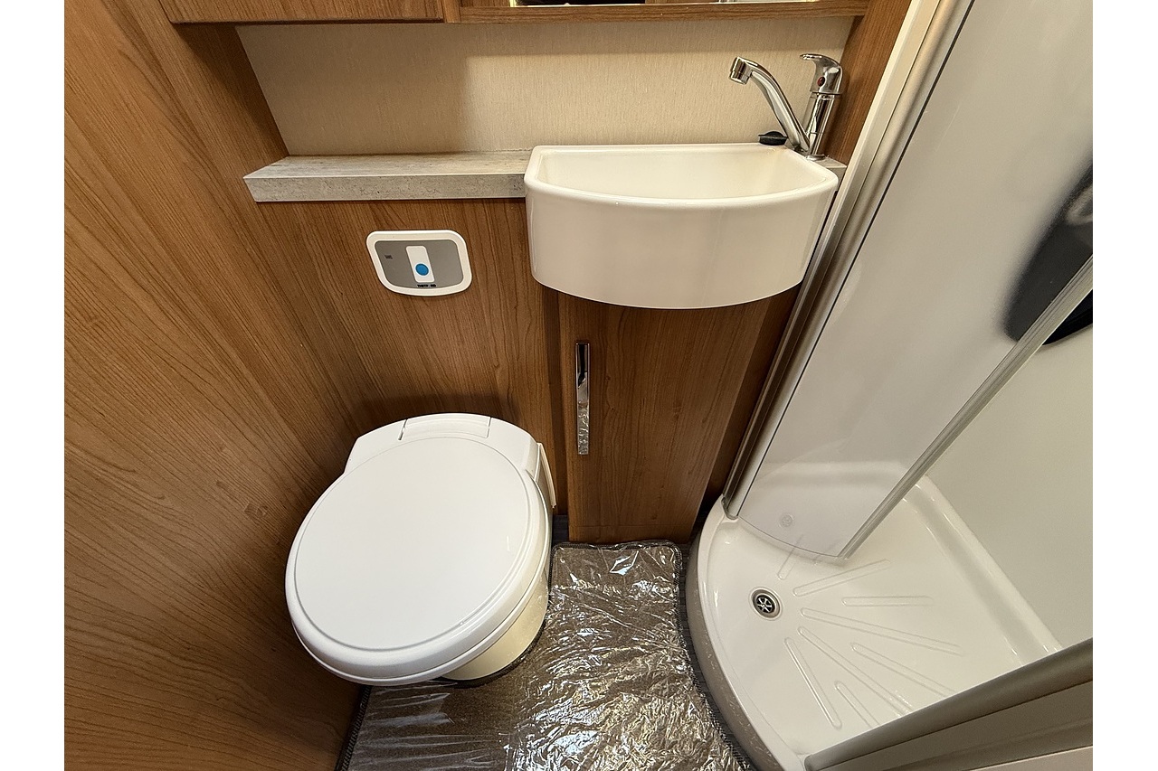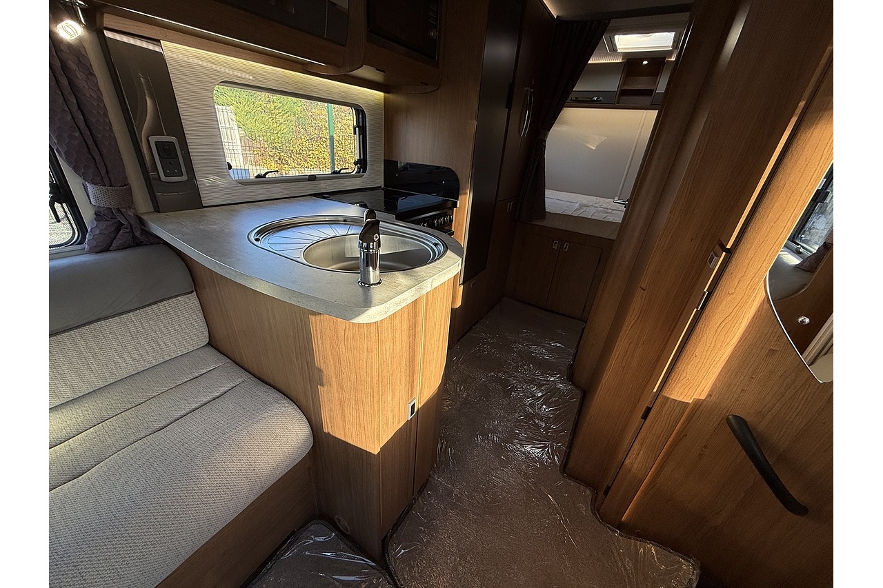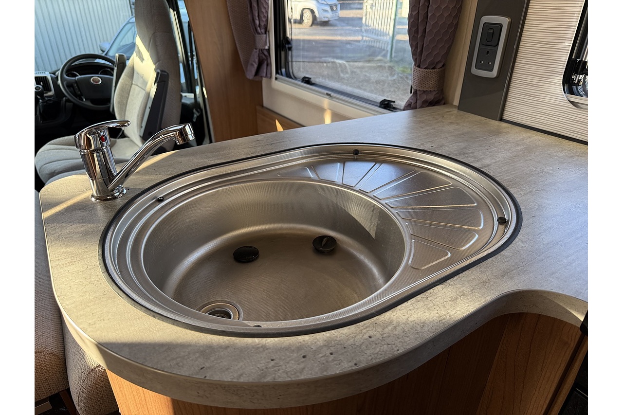 The fully equipped kitchen is a real strength of this model, offering one of the largest counter areas in its class along with excellent storage. It includes a hob, oven/grill, fridge/freezer, microwave (where fitted) and a stainless steel sink – perfect for longer touring or cooking on the road.