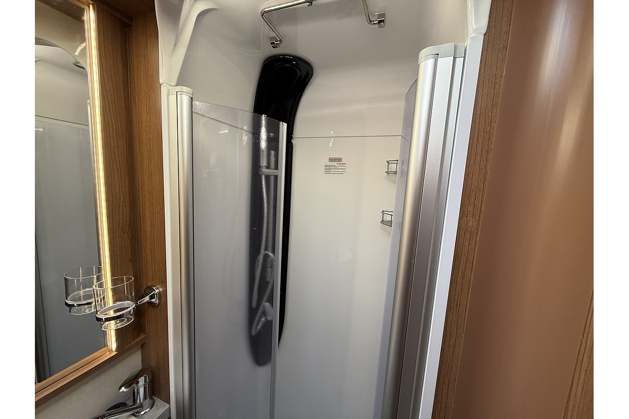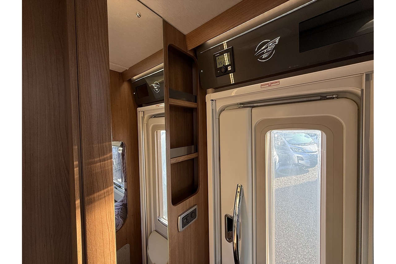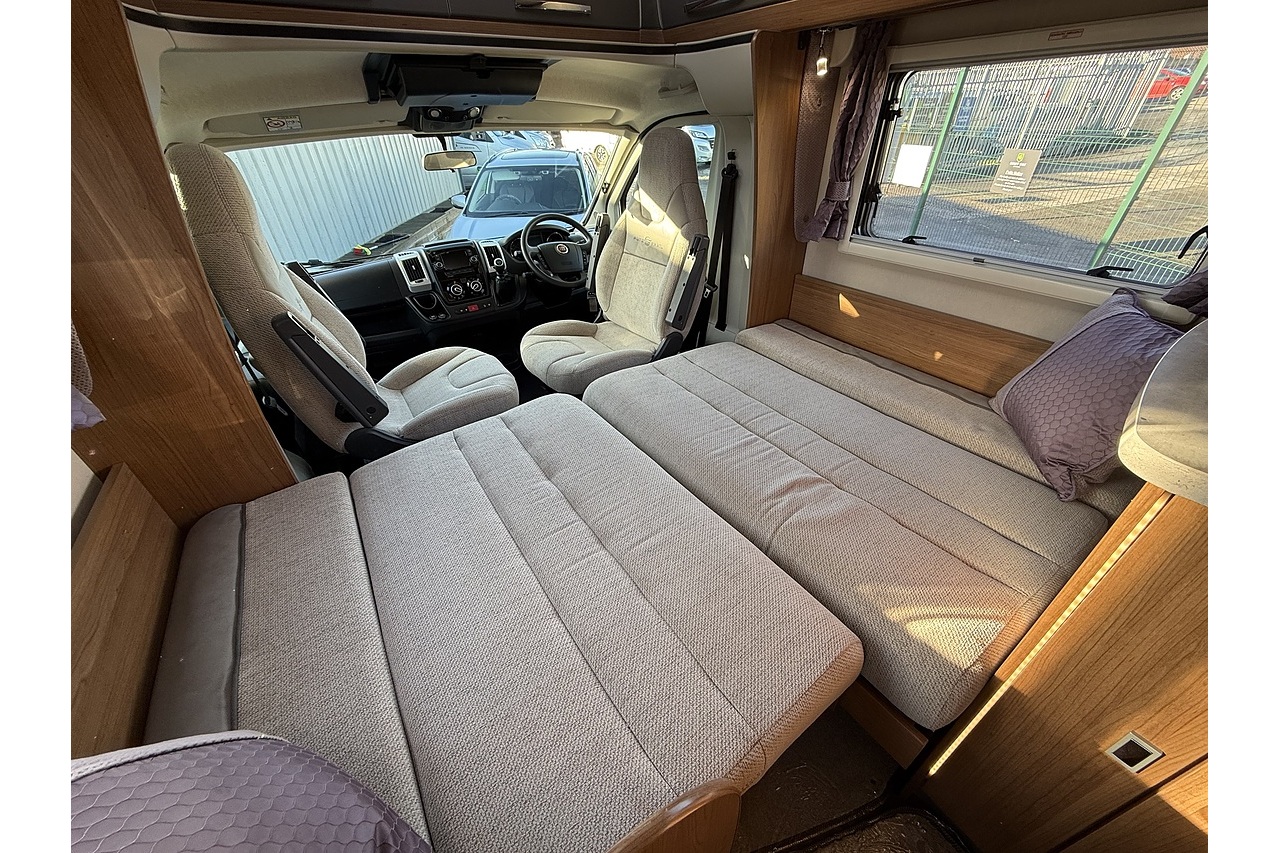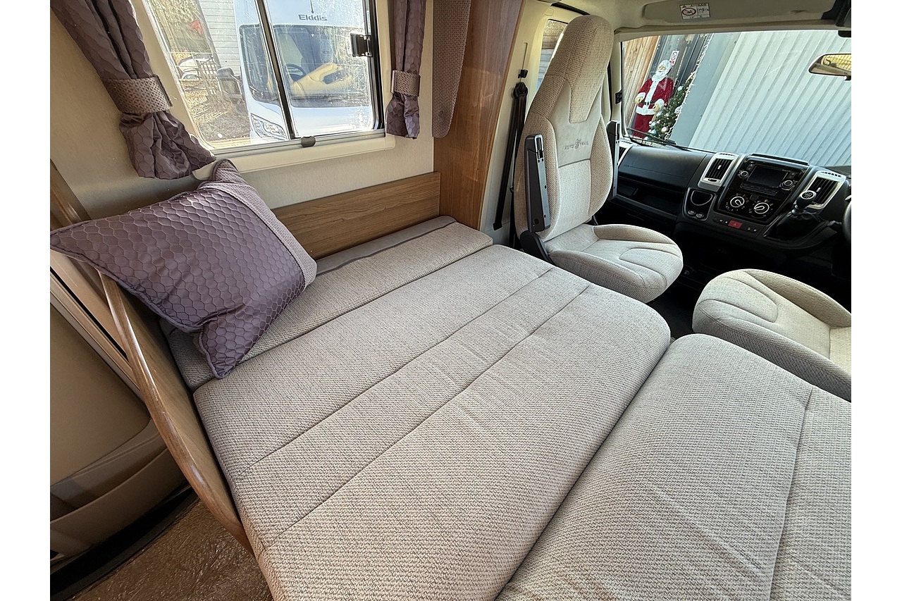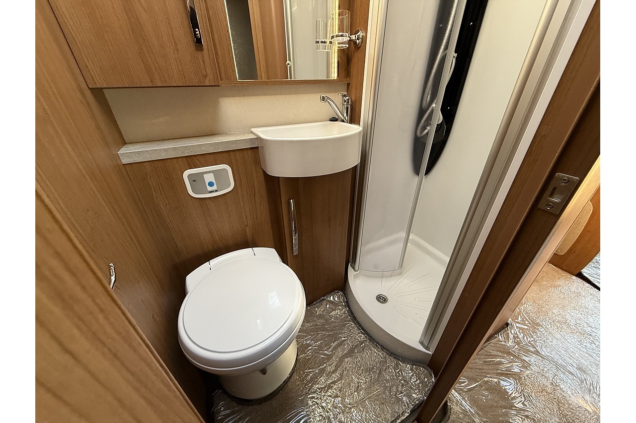 The fully equipped kitchen is a real strength of this model, offering one of the largest counter areas in its class along with excellent storage. It includes a hob, oven/grill, fridge/freezer, microwave (where fitted) and a stainless steel sink – perfect for longer touring or cooking on the road.