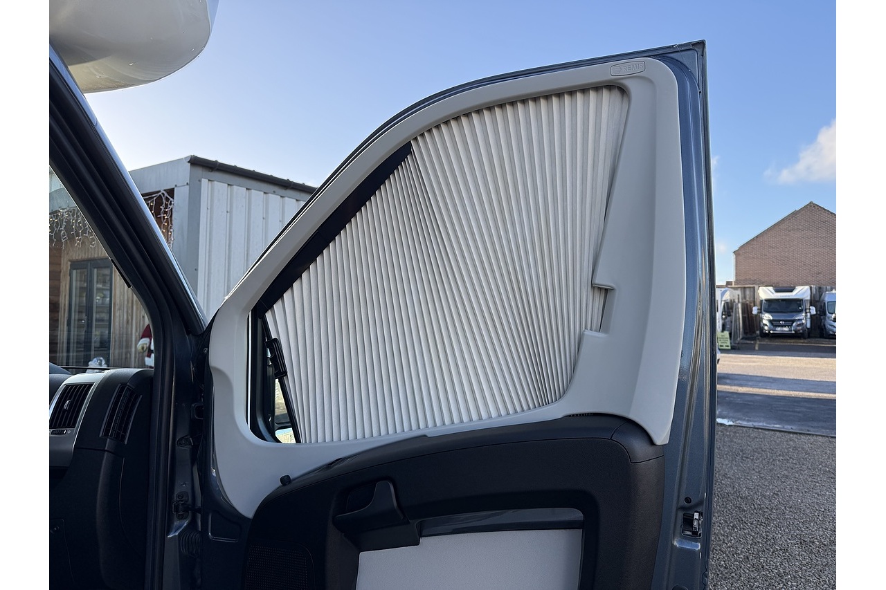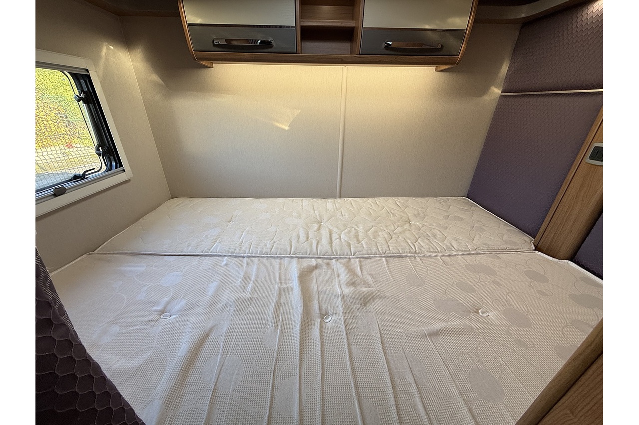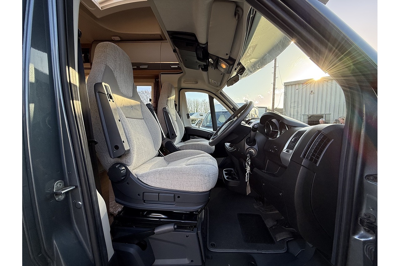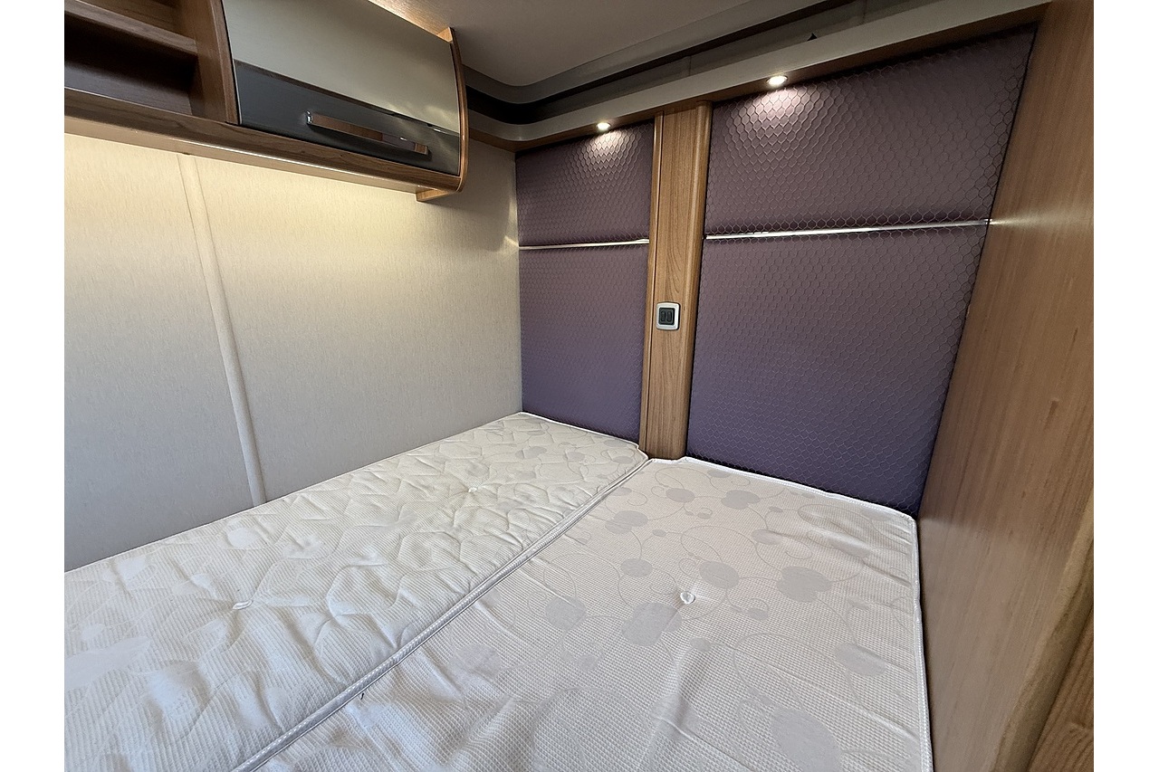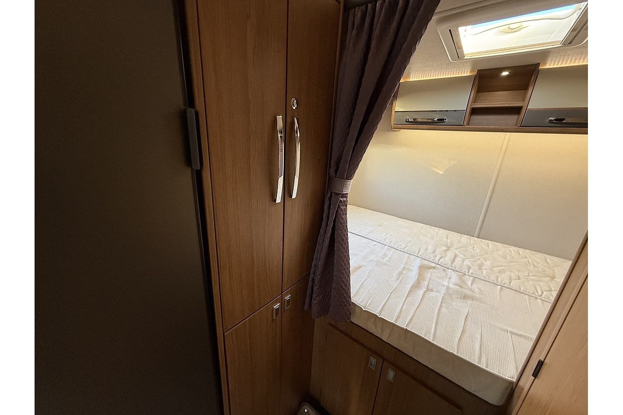 The fully equipped kitchen is a real strength of this model, offering one of the largest counter areas in its class along with excellent storage. It includes a hob, oven/grill, fridge/freezer, microwave (where fitted) and a stainless steel sink – perfect for longer touring or cooking on the road.