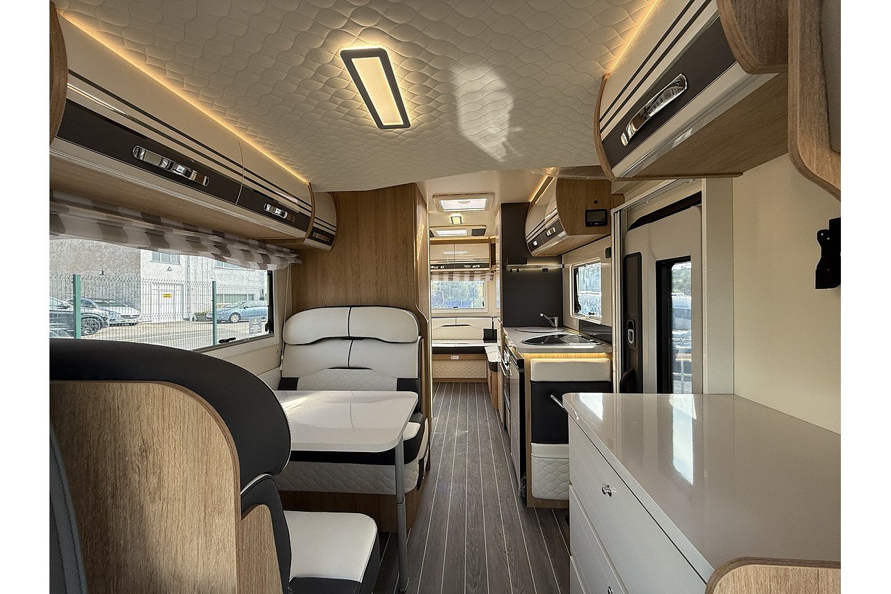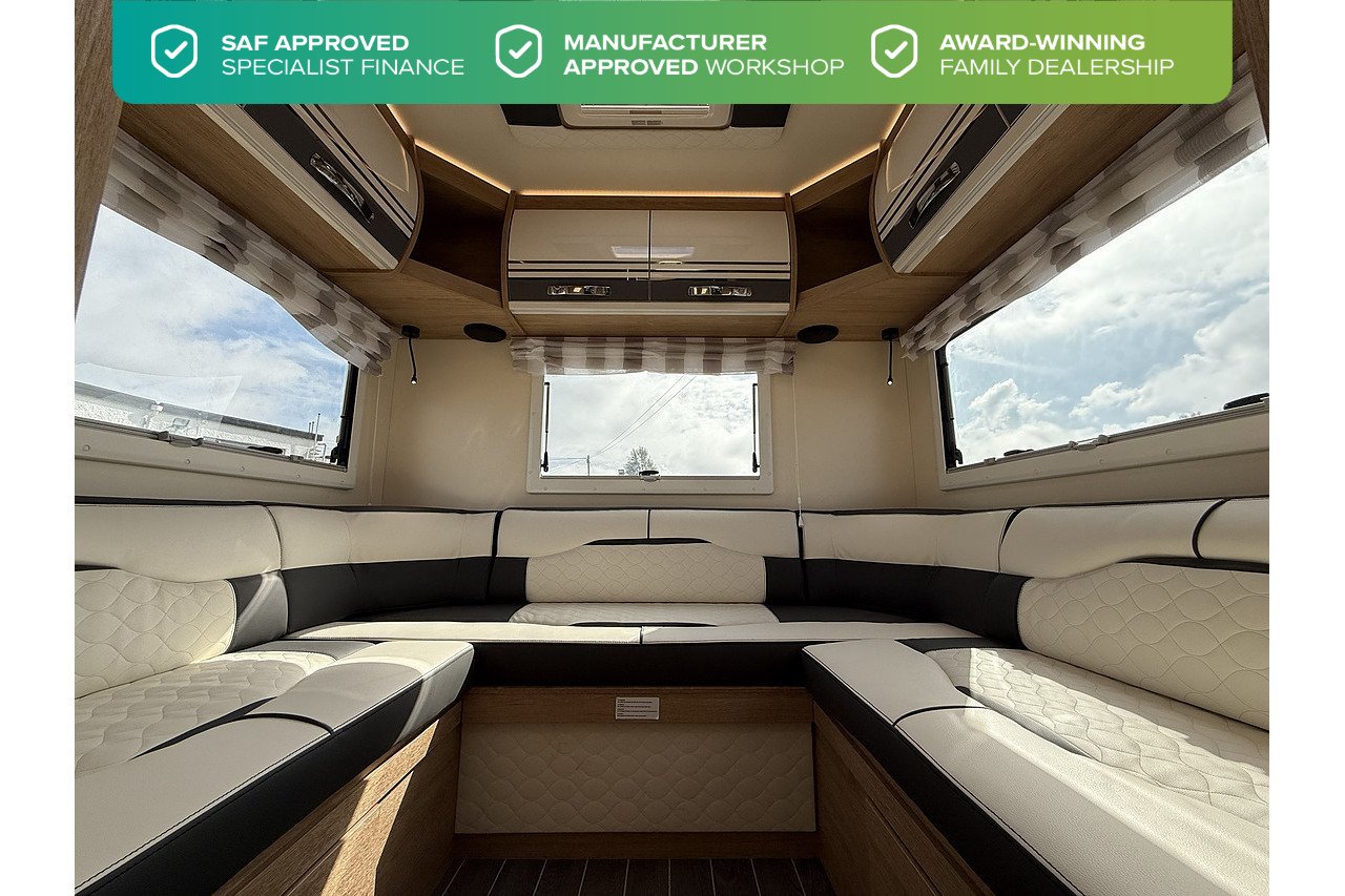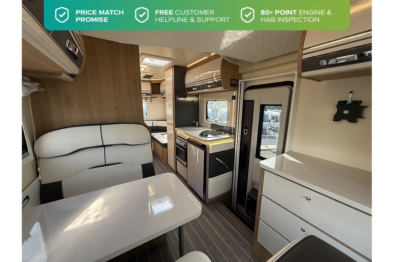 Inside, the 747 impresses with its spacious rear lounge, a true hallmark of this model. This large and comfortable area provides ample room for relaxing during the day and converts effortlessly into a king-size double bed at night. The front dinette adds extra living space and houses a convenient electric drop-down bed, creating sleeping accommodation for up to six people – perfect for families or those who enjoy hosting guests.
