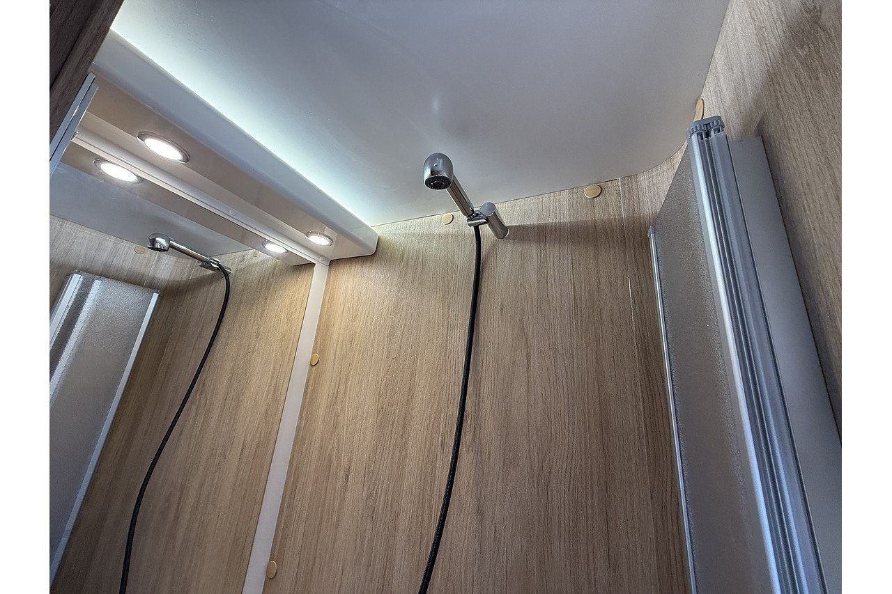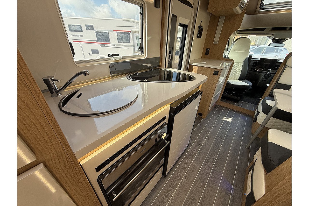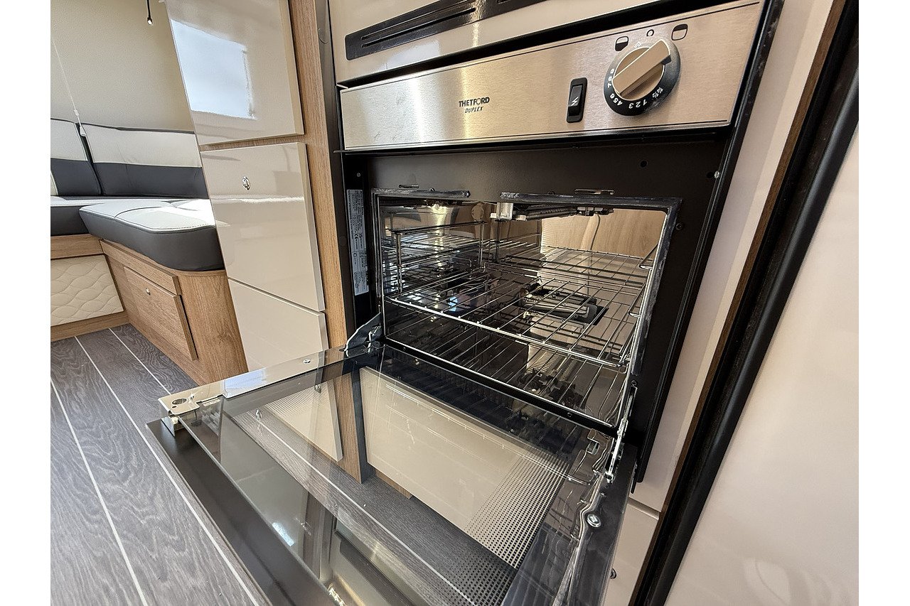 The fully equipped kitchen offers excellent worktop space and high-quality fittings, including a gas hob, oven/grill, sink, and a large fridge/freezer, allowing you to cook and dine in comfort wherever your adventures take you.