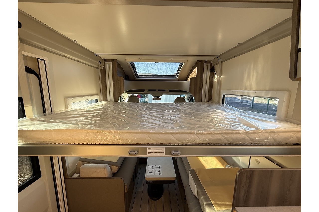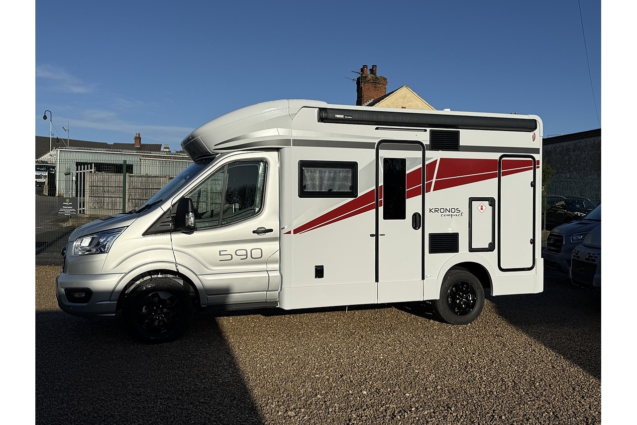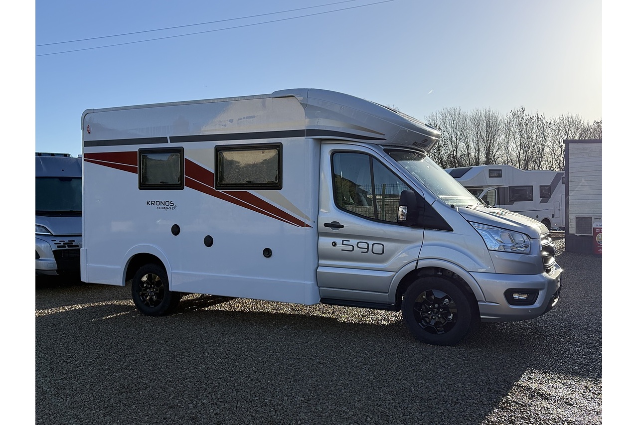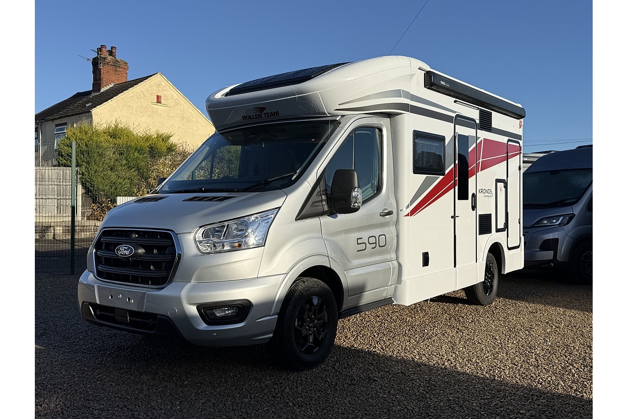The 2026 Roller Team Kronos Compact 590 offers clever space utilisation in a slim coachbuilt body, built on the Ford Transit 2.0L 165BHP Automatic for smooth, confident driving. Under 6 m in length but impressively spacious inside, this layout features a drop-down fixed double bed above the open dinette, maximising living space without compromising sleeping comfort.