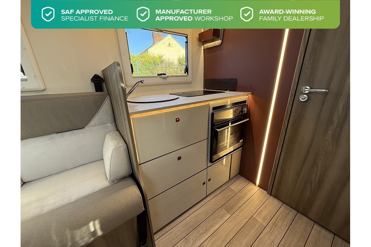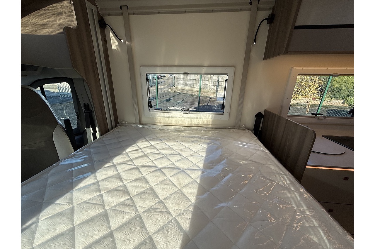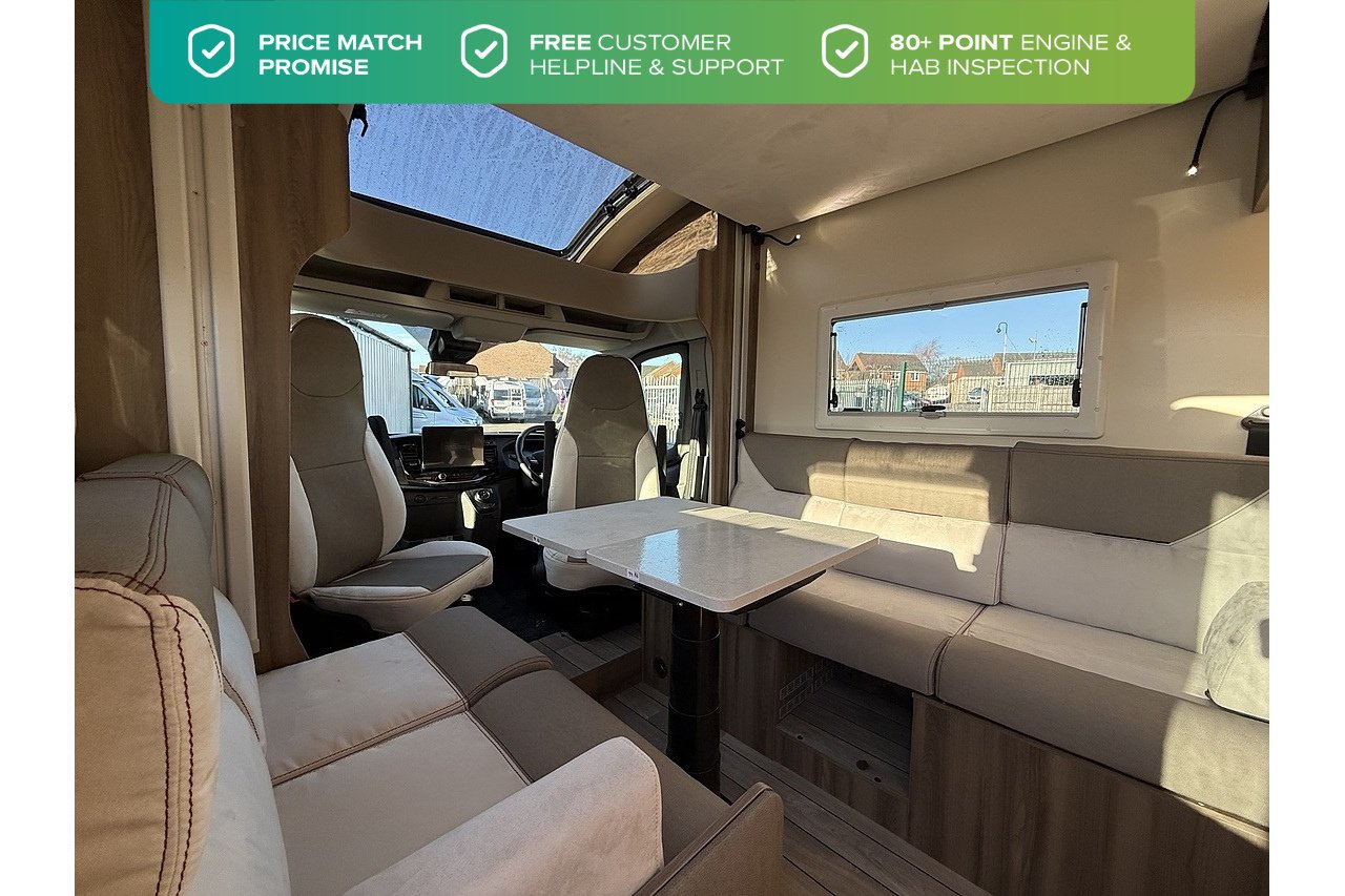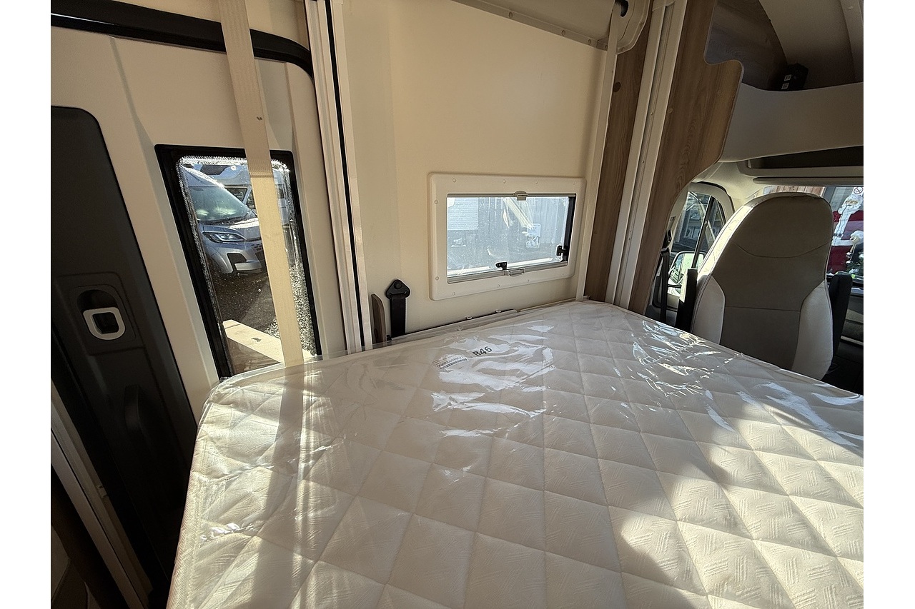 The 2026 Roller Team Kronos Compact 590 offers clever space utilisation in a slim coachbuilt body, built on the Ford Transit 2.0L 165BHP Automatic for smooth, confident driving. Under 6 m in length but impressively spacious inside, this layout features a drop-down fixed double bed above the open dinette, maximising living space without compromising sleeping comfort.