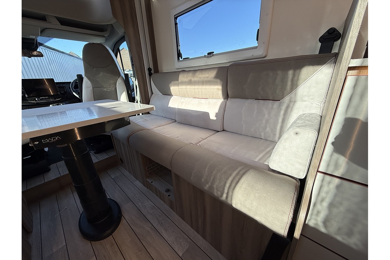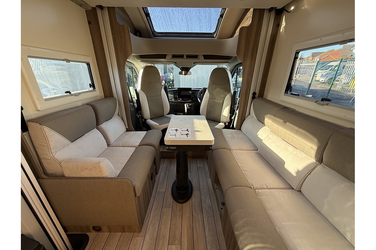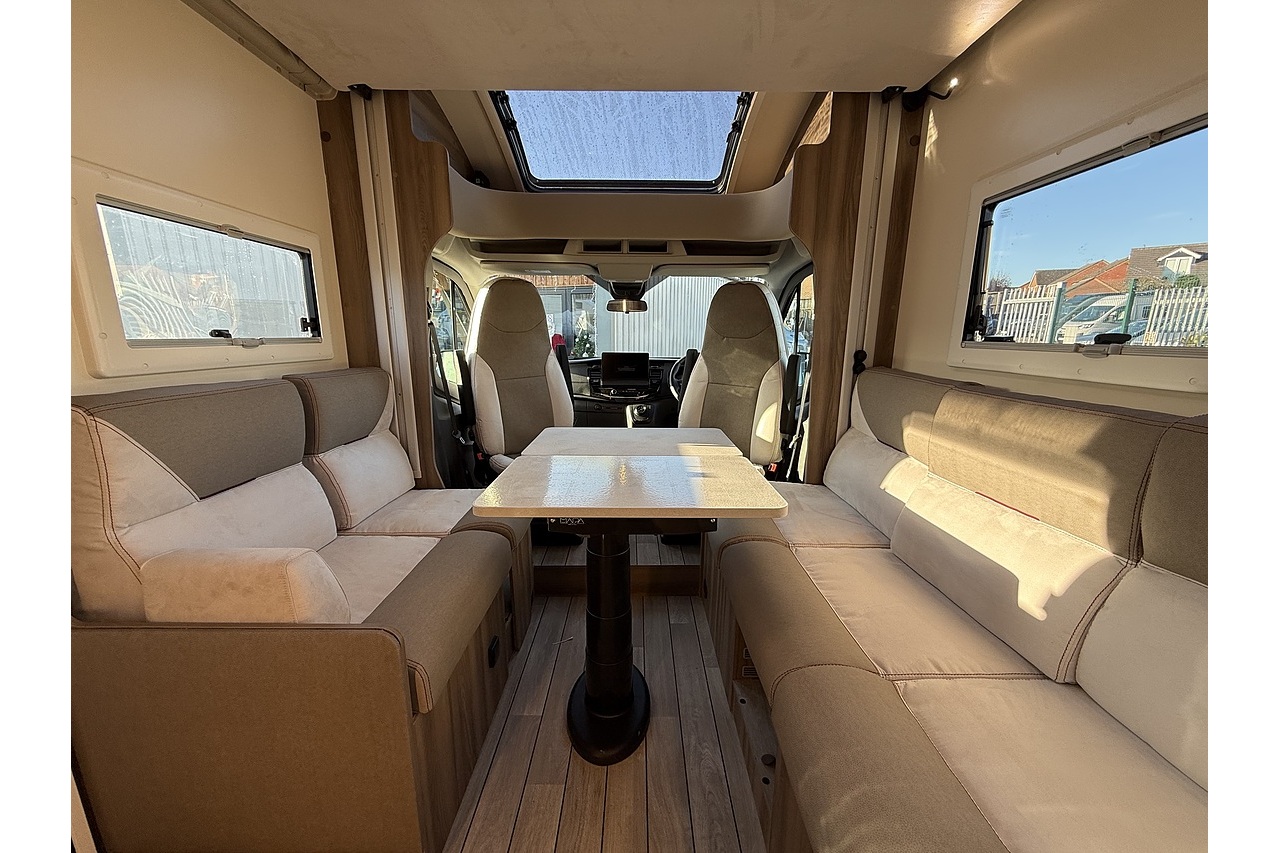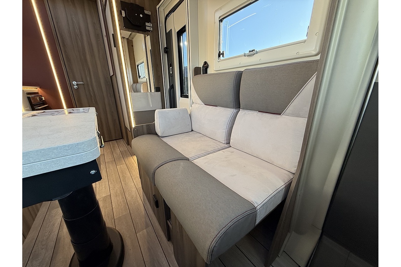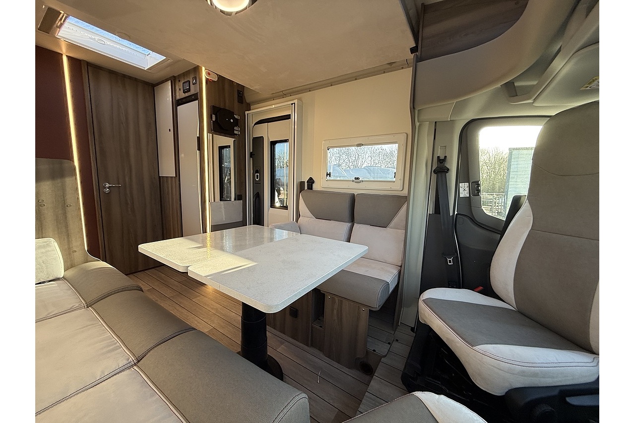 At the rear, a full-width bathroom provides a separate shower, toilet and basin – a premium feature rarely found in a motorhome this size. The front dinette is bright, social and stylish, finished with Roller Team’s modern Italian interior design.