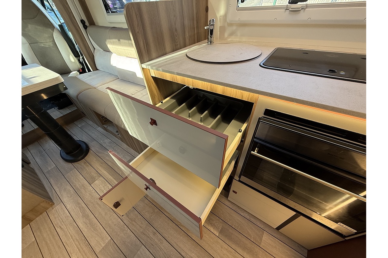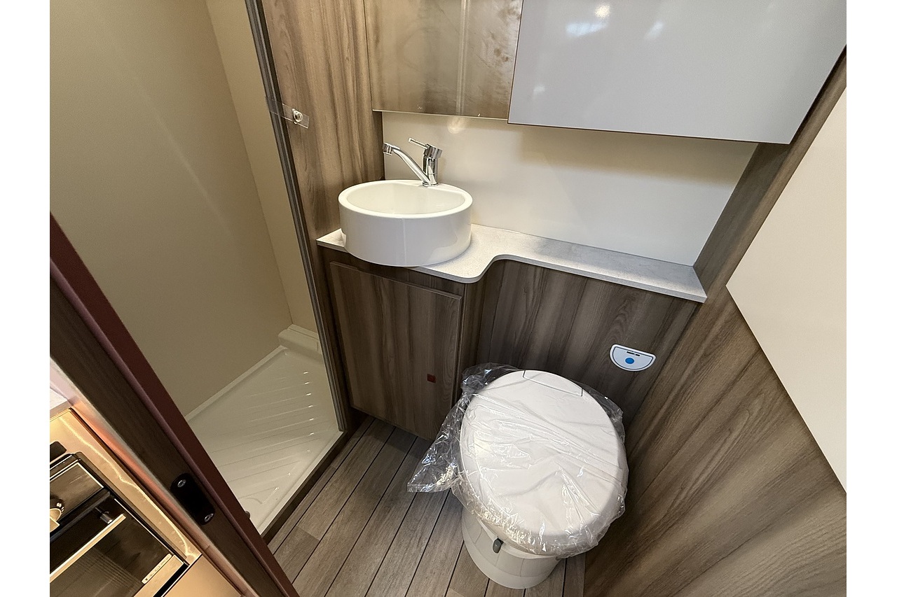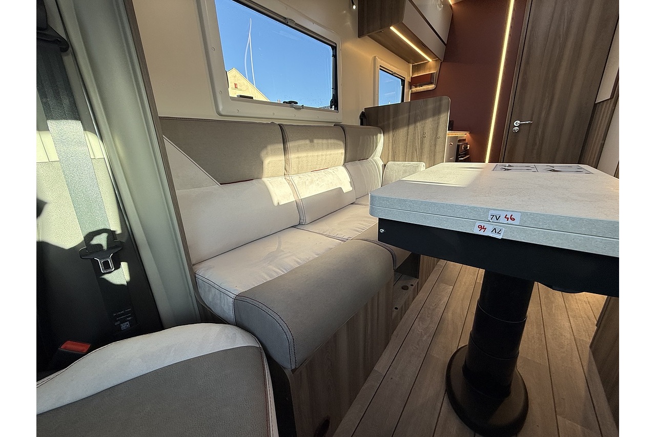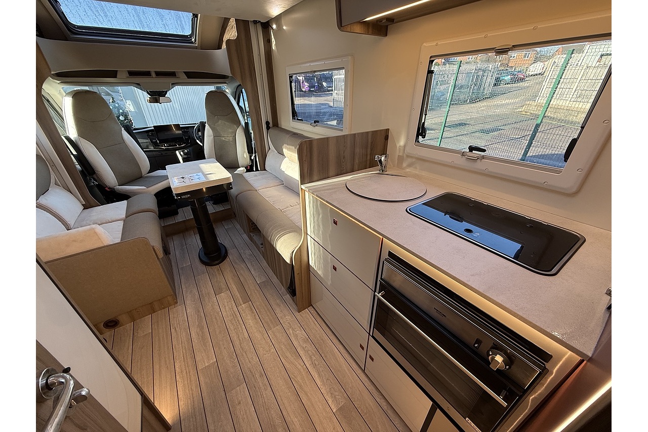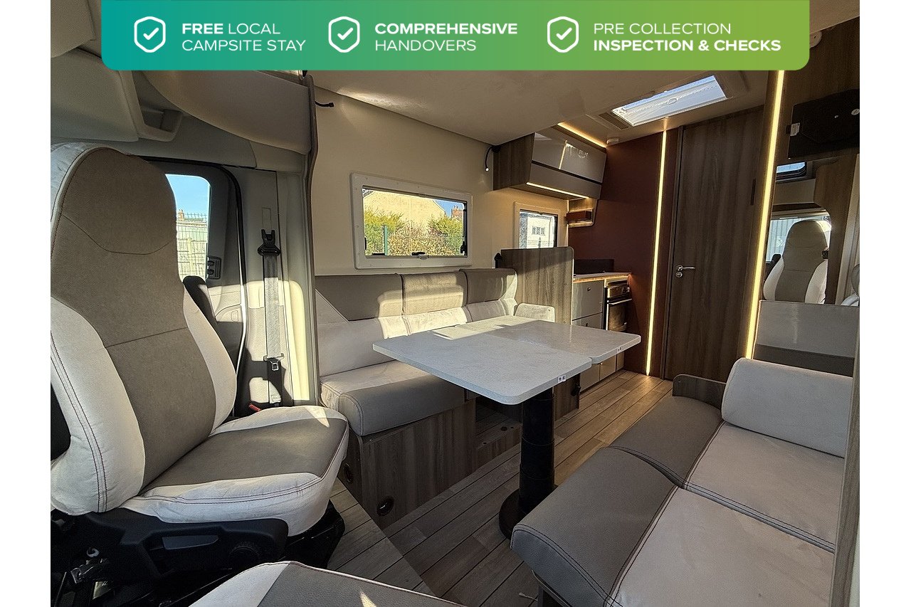 At the rear, a full-width bathroom provides a separate shower, toilet and basin – a premium feature rarely found in a motorhome this size. The front dinette is bright, social and stylish, finished with Roller Team’s modern Italian interior design.