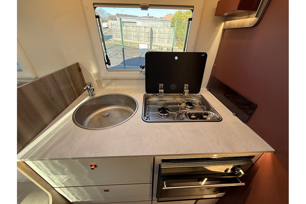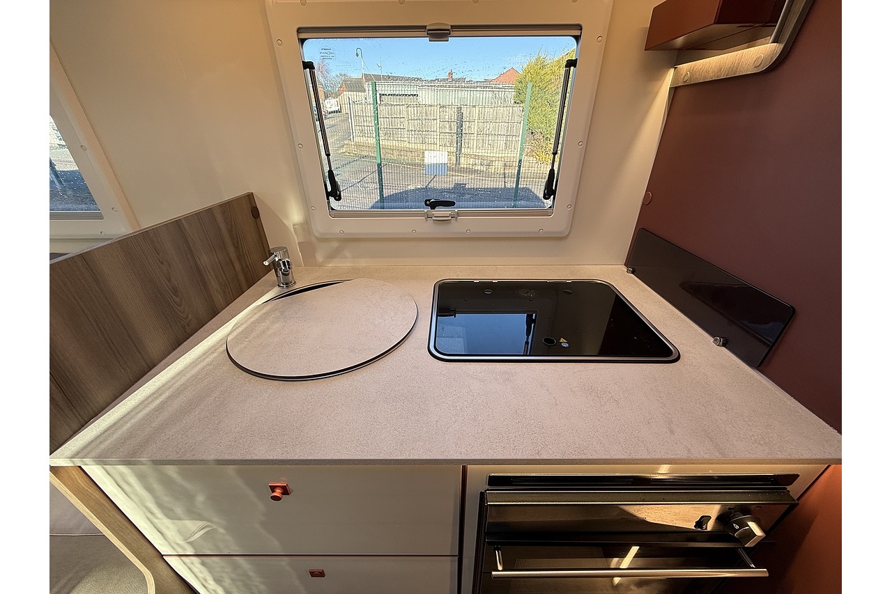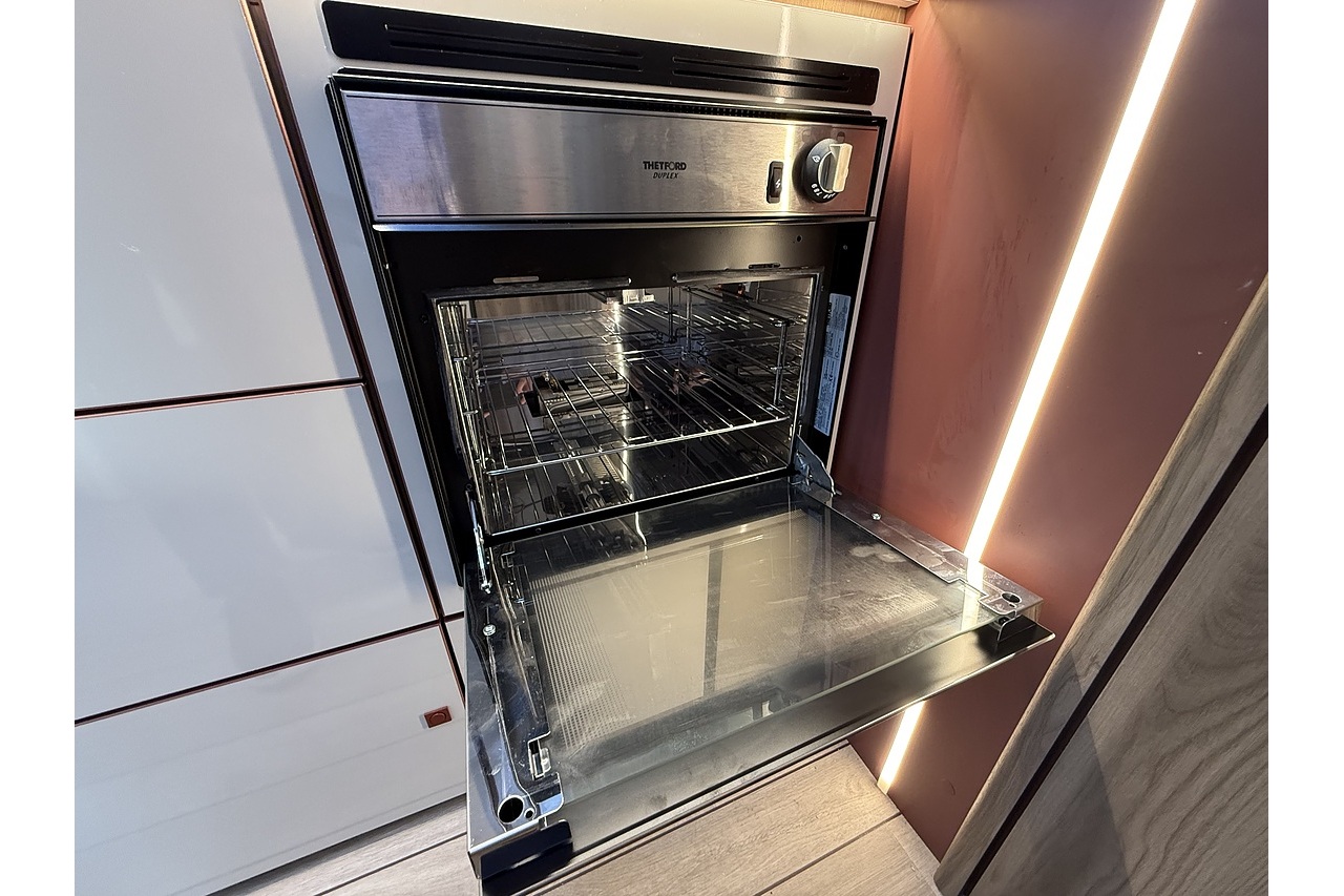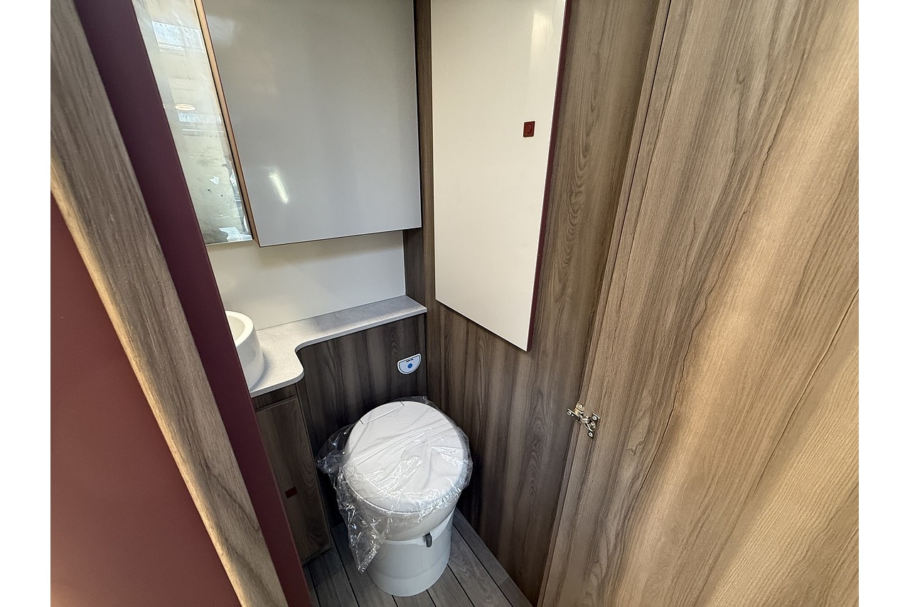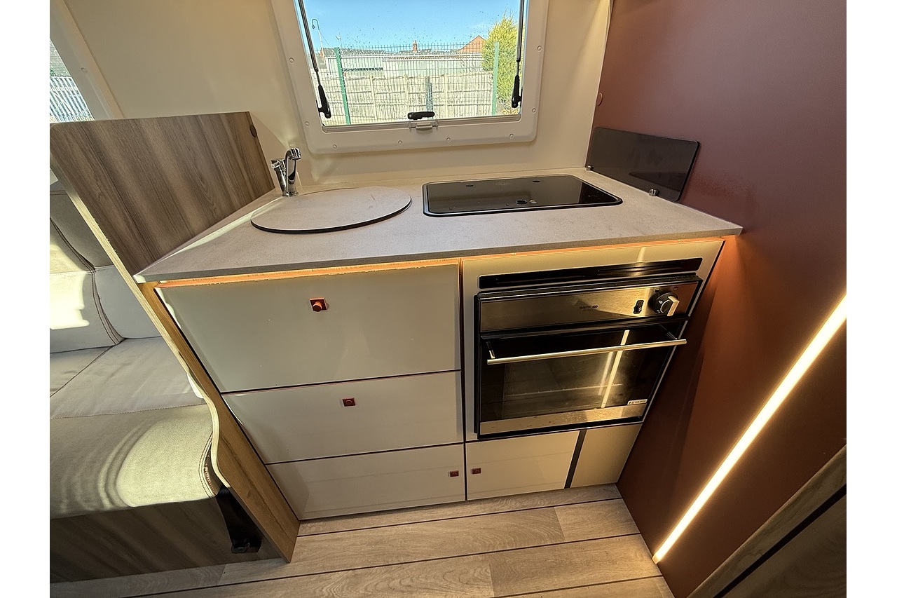 At the rear, a full-width bathroom provides a separate shower, toilet and basin – a premium feature rarely found in a motorhome this size. The front dinette is bright, social and stylish, finished with Roller Team’s modern Italian interior design.