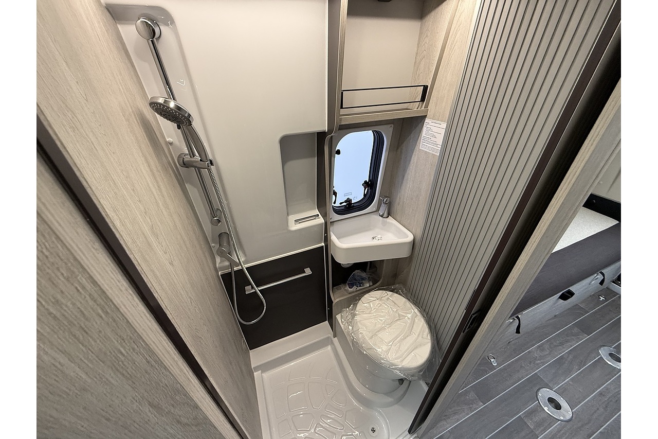 A fully equipped central kitchen provides everything you need on the road, while the washroom includes a toilet, shower and washbasin for complete self-sufficiency on every adventure.