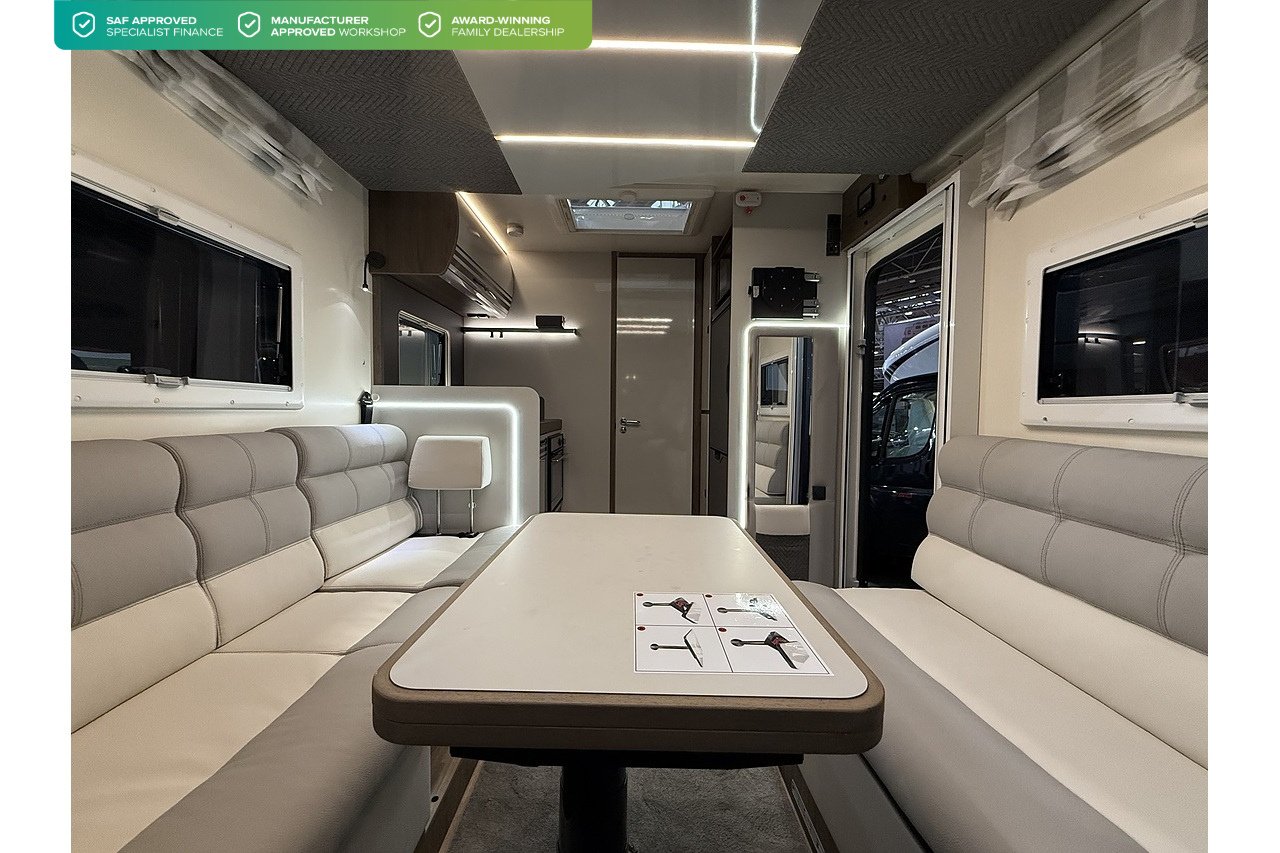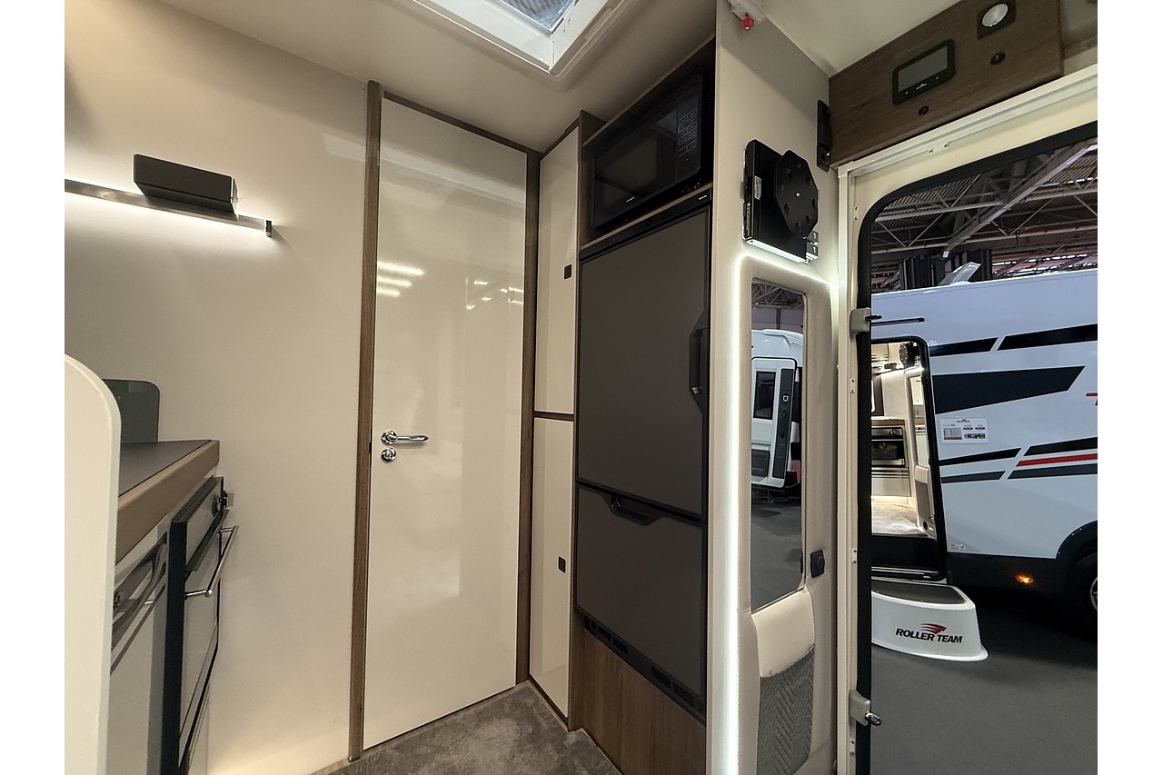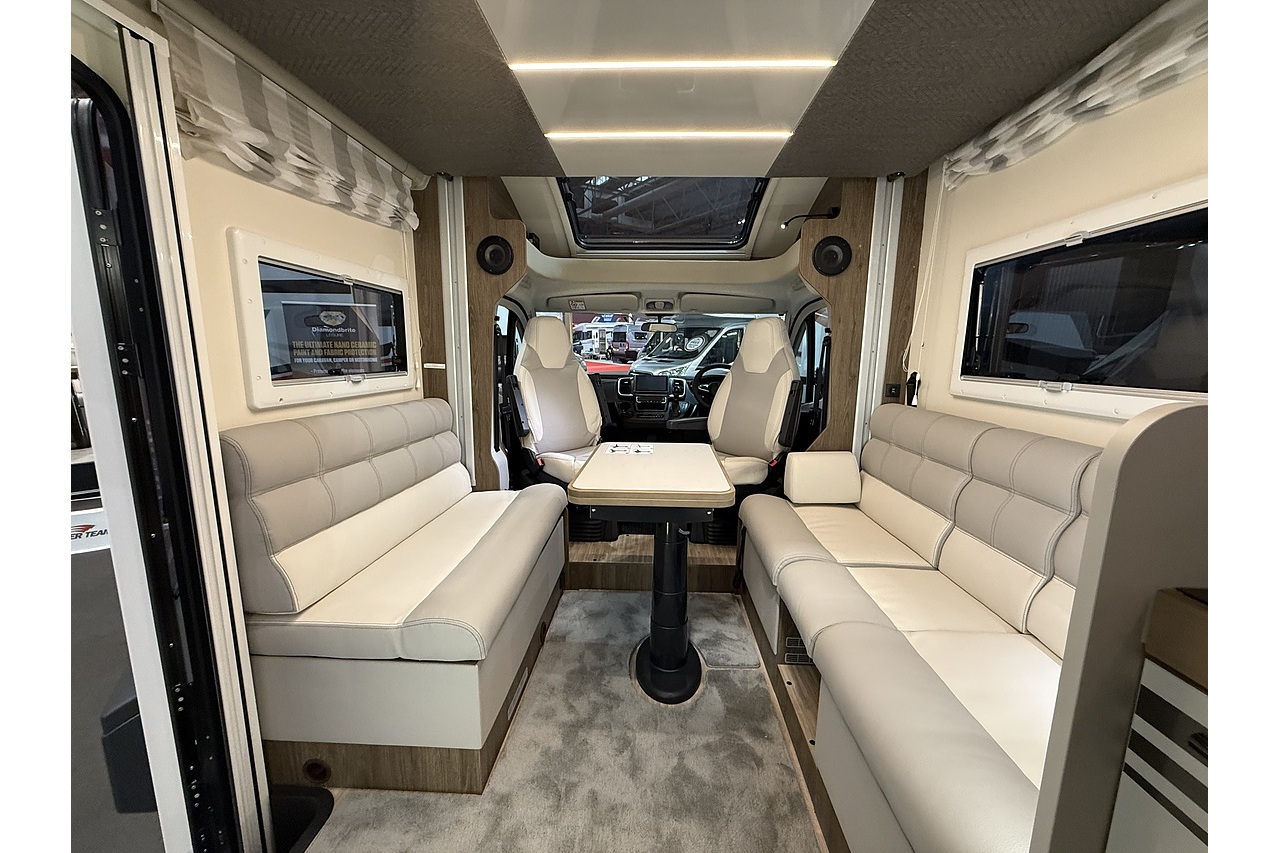 Inside, the stylish front lounge and dinette provide a bright and sociable living space, complete with swivel cab seats and Roller Team’s signature Italian craftsmanship. Above, an electric drop-down double bed lowers smoothly into place at night, leaving the lounge area free for use during the day.