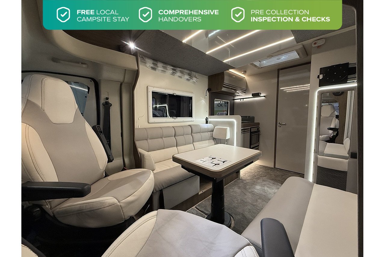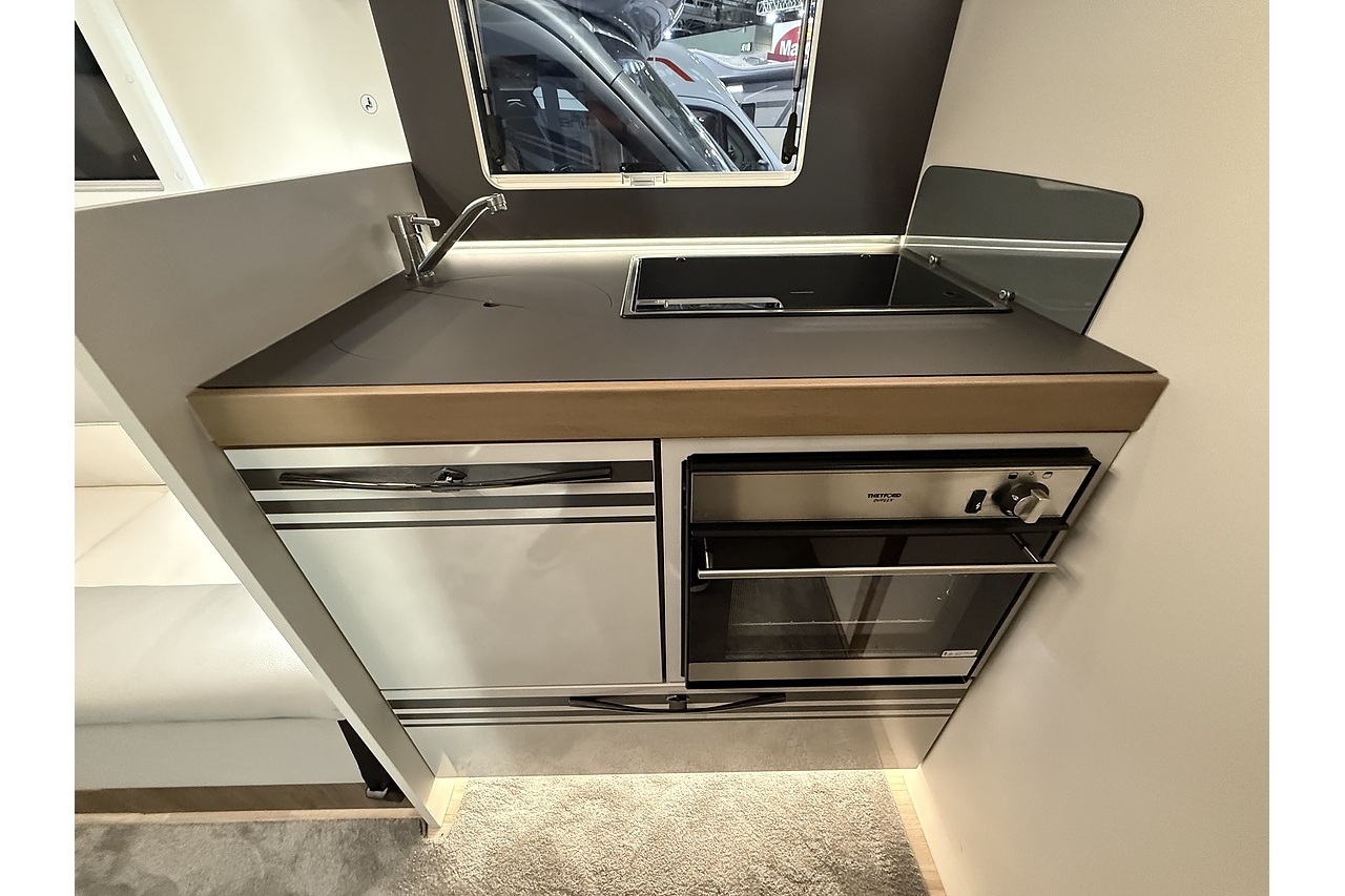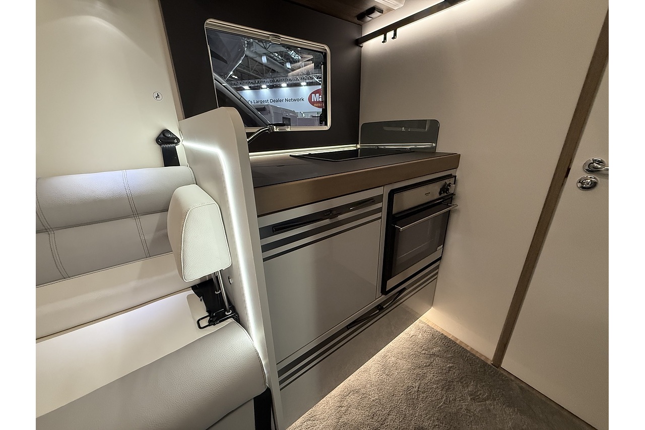 Inside, the stylish front lounge and dinette provide a bright and sociable living space, complete with swivel cab seats and Roller Team’s signature Italian craftsmanship. Above, an electric drop-down double bed lowers smoothly into place at night, leaving the lounge area free for use during the day.