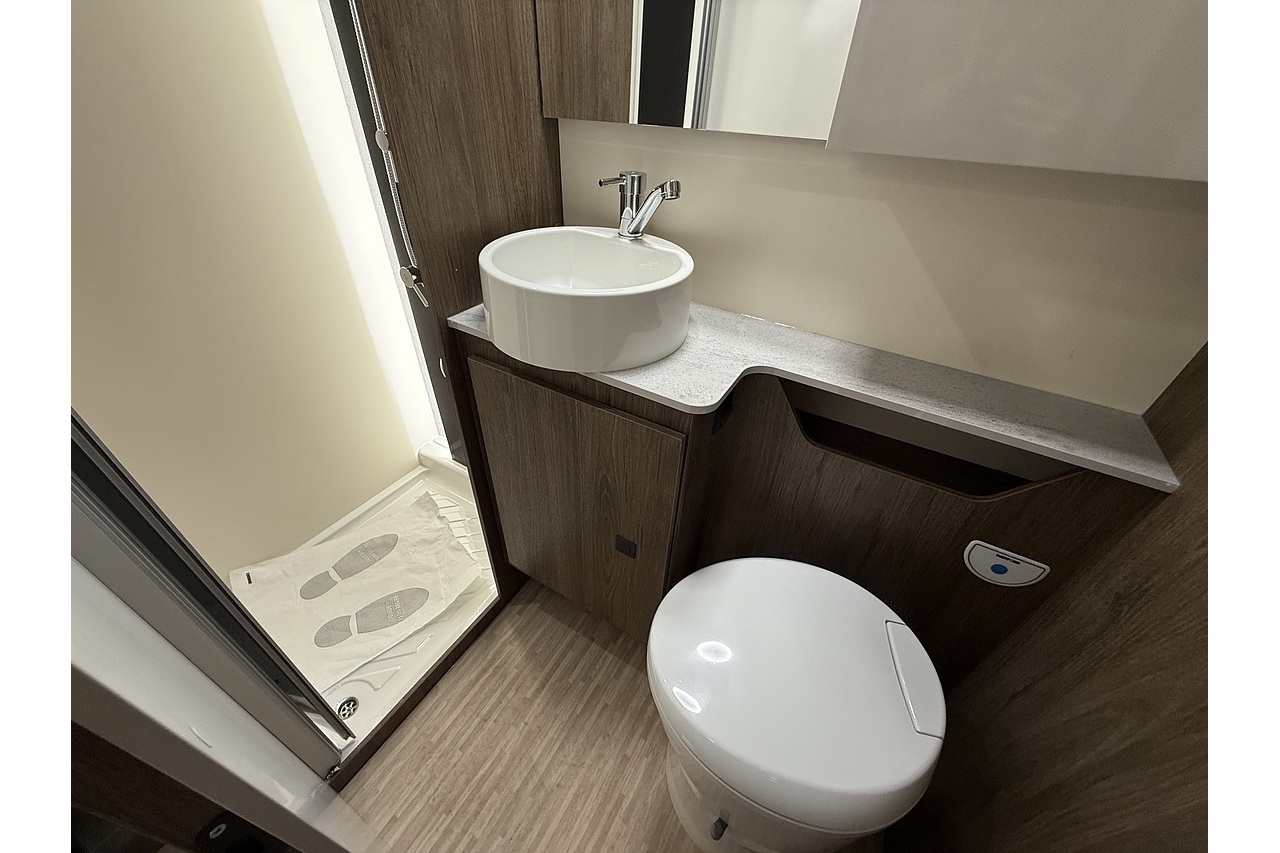 At the rear, a spacious bathroom spans the full width of the vehicle, featuring a separate shower cubicle, toilet, and washbasin — a rare luxury in a motorhome of this size.