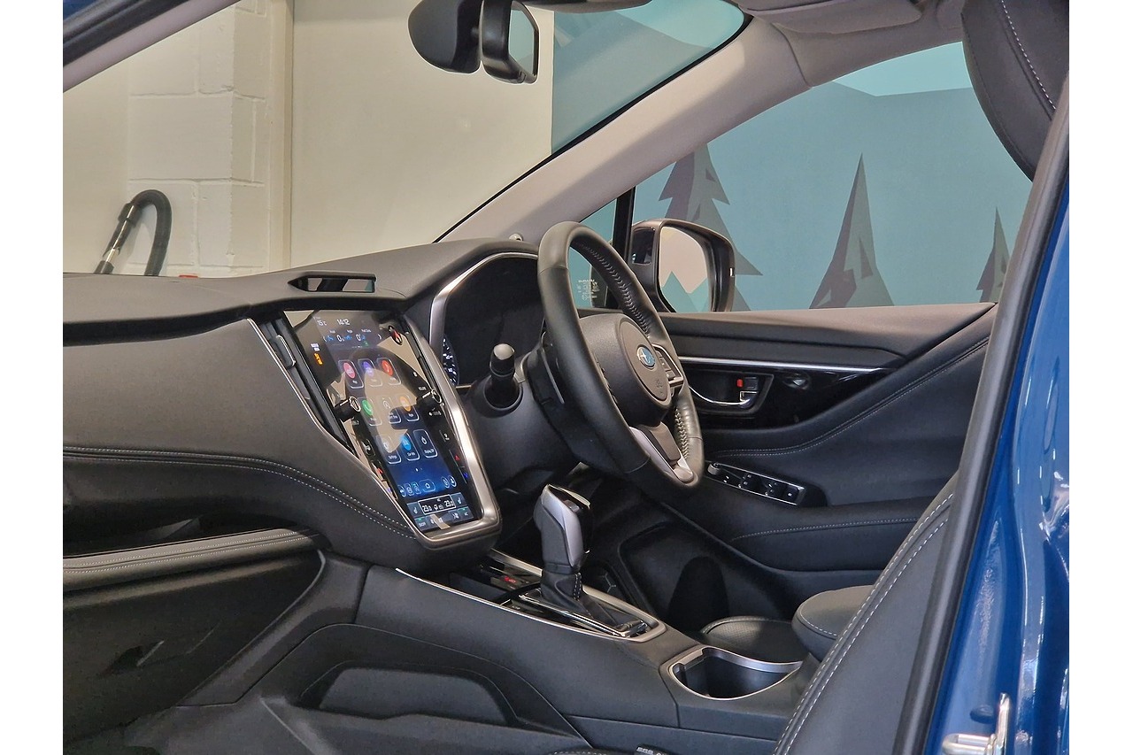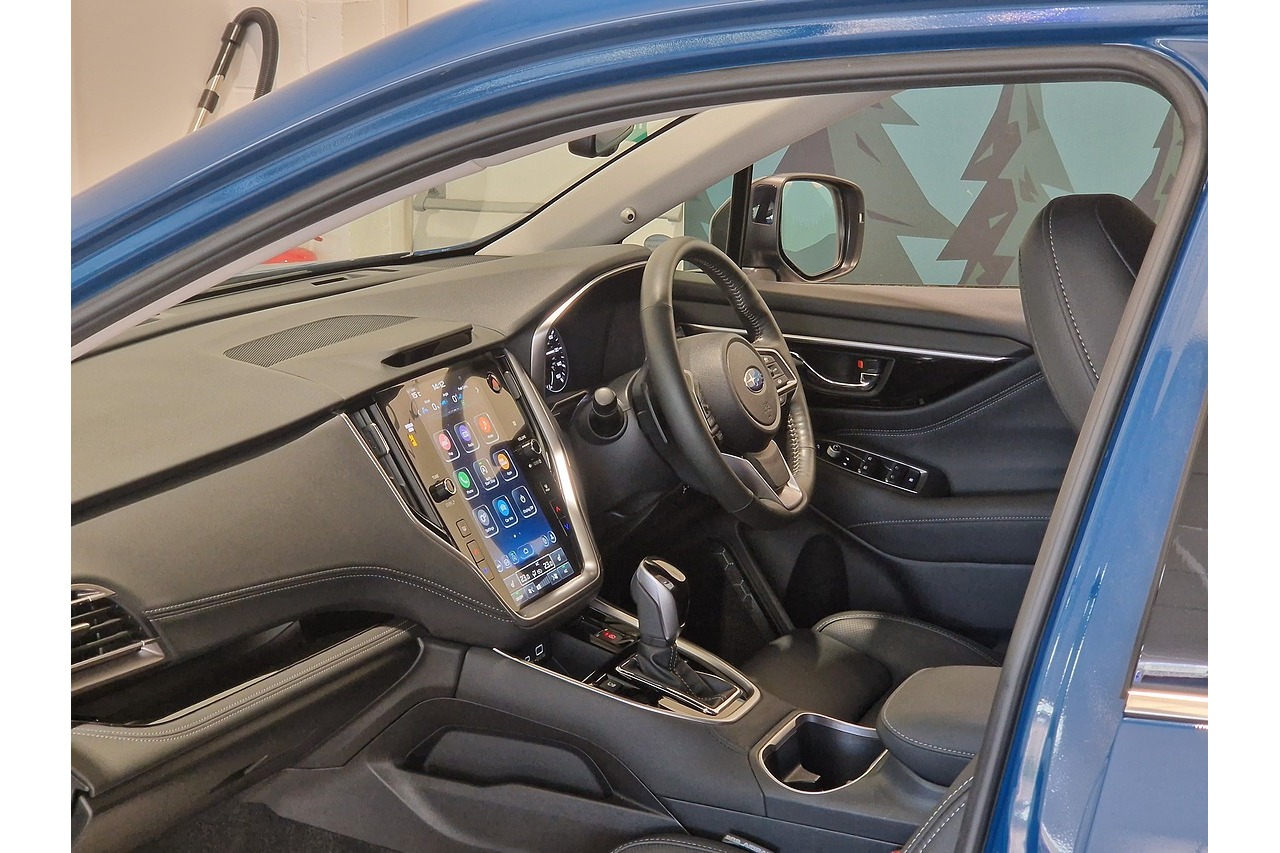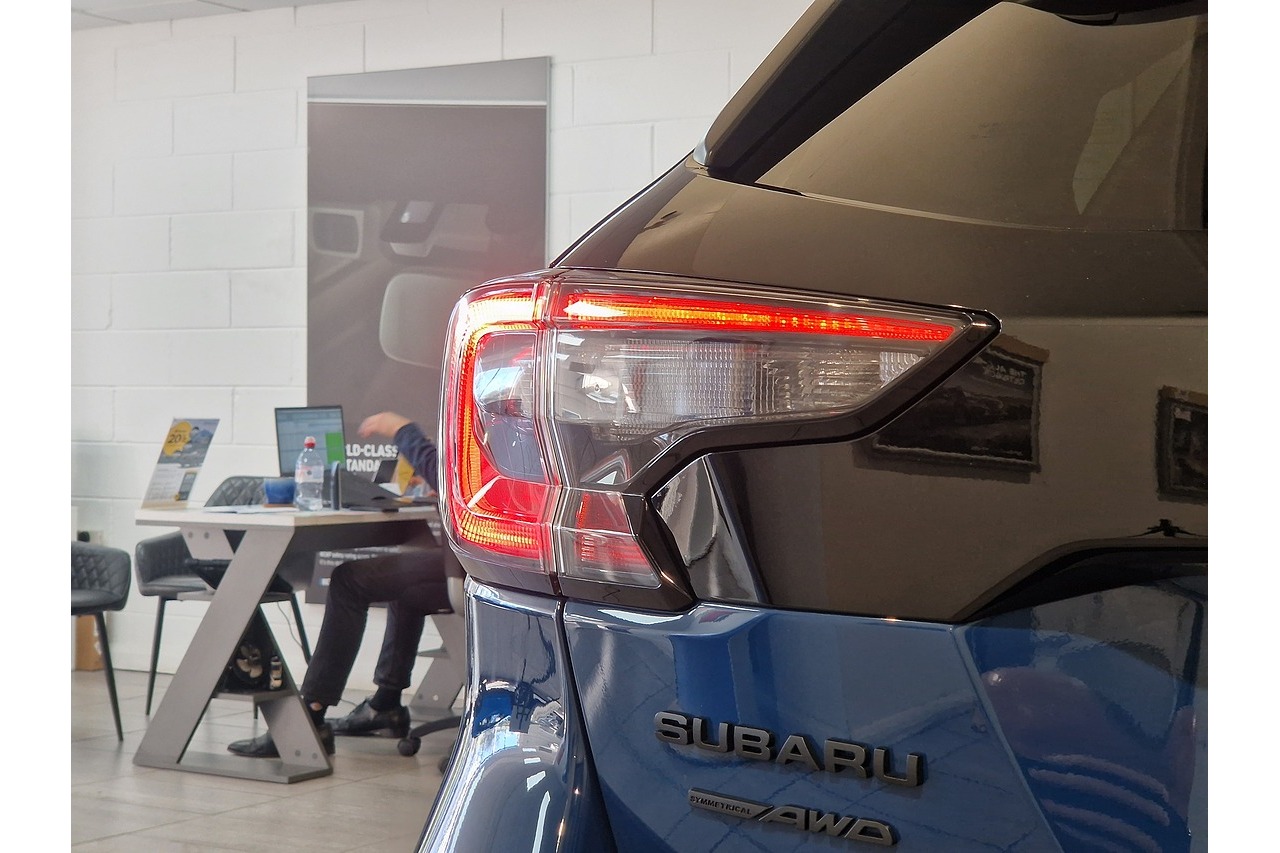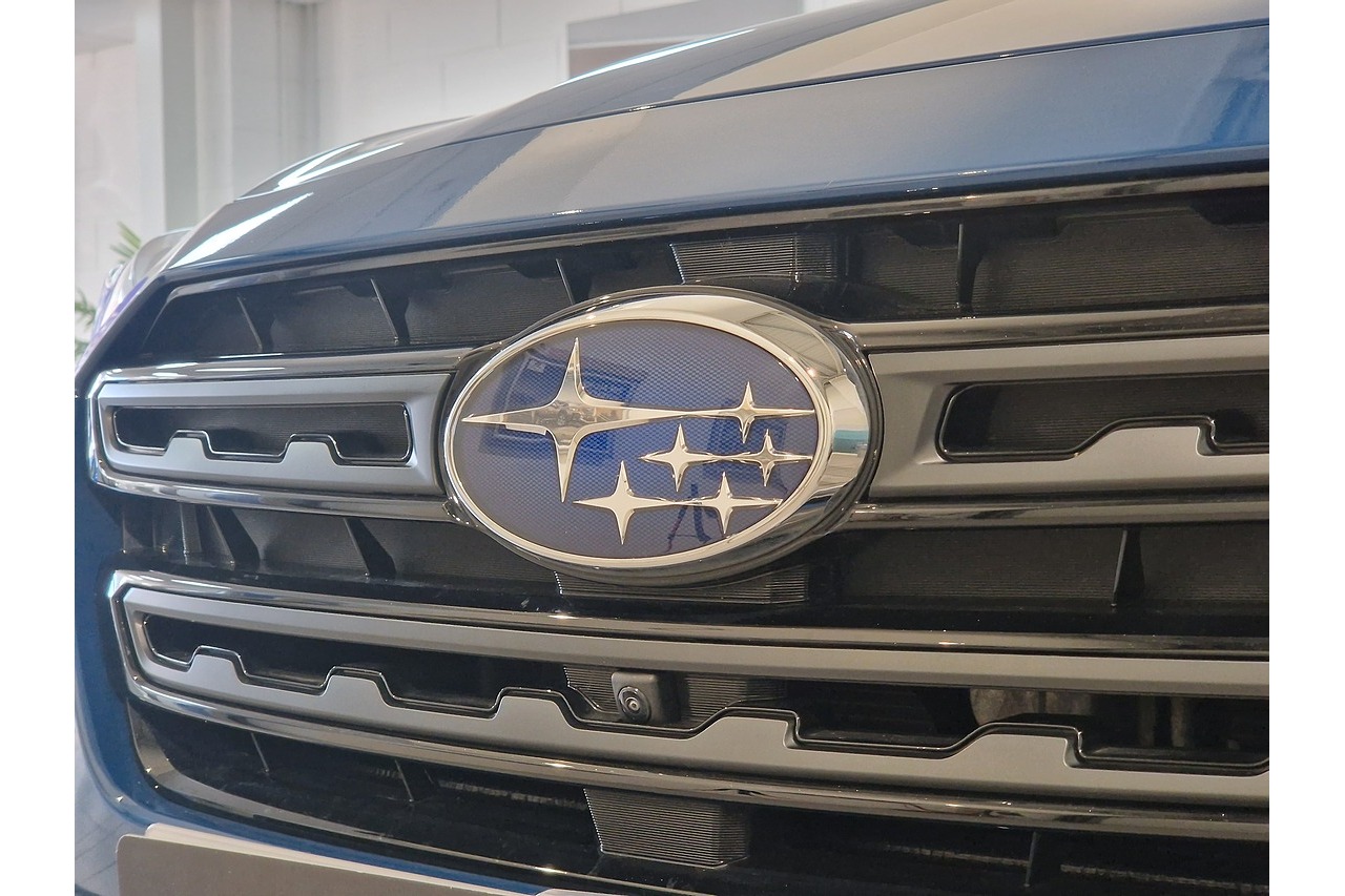 Exterior Design: The vehicle boasts an exclusive Subaru Geyser Blue metallic paint finish, complemented by dark metallic 18-inch alloy wheels, crystal black door mirrors, and black roof rails with increased load capacity. Gloss black accents on the front grille and lower bumpers enhance its robust exterior styling.