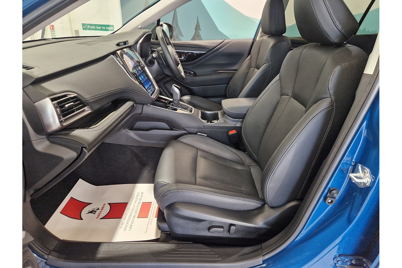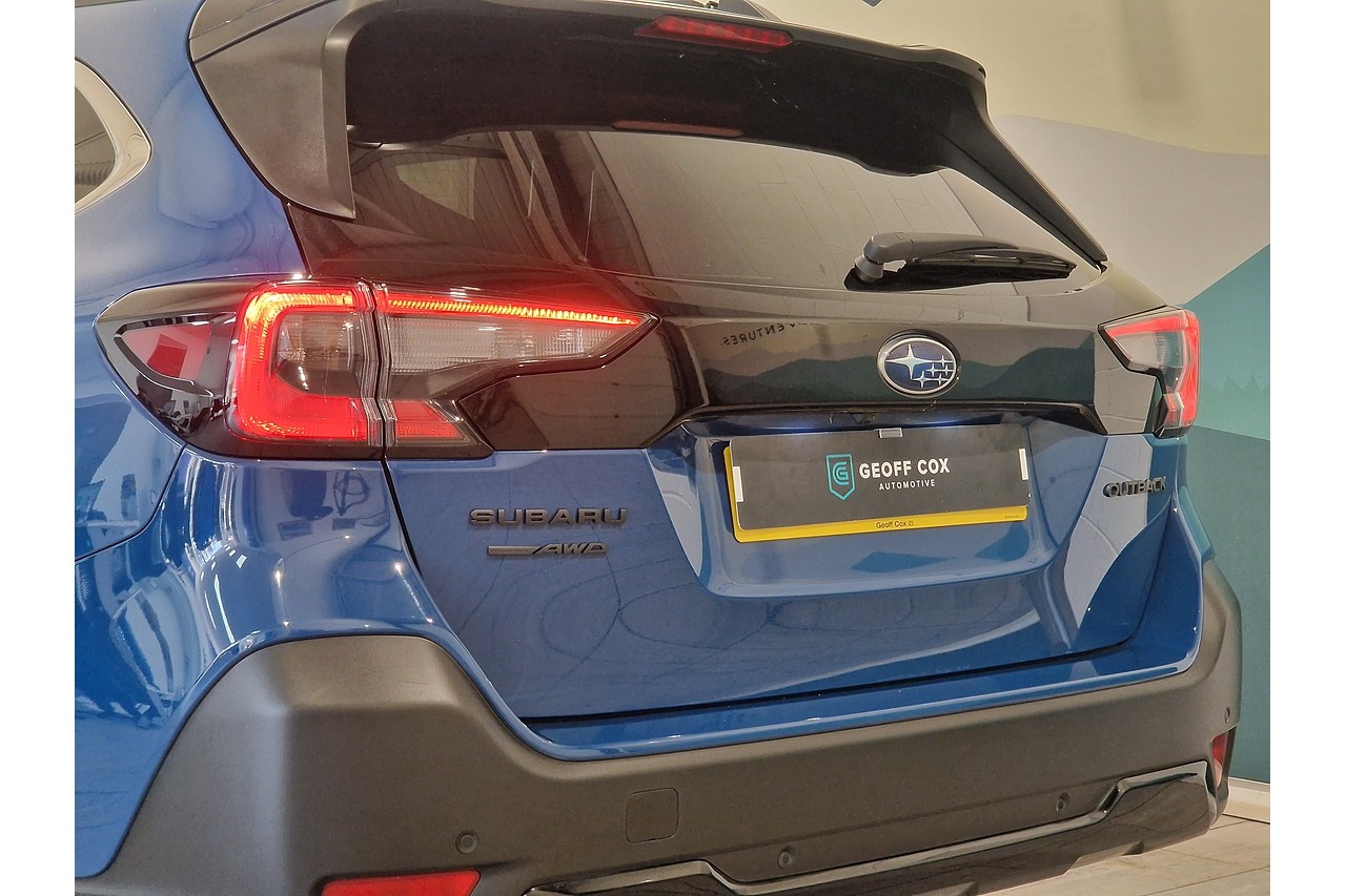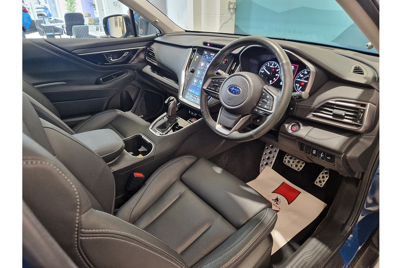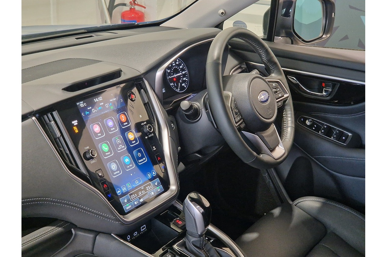 Exterior Design: The vehicle boasts an exclusive Subaru Geyser Blue metallic paint finish, complemented by dark metallic 18-inch alloy wheels, crystal black door mirrors, and black roof rails with increased load capacity. Gloss black accents on the front grille and lower bumpers enhance its robust exterior styling.