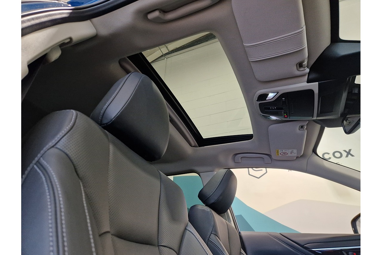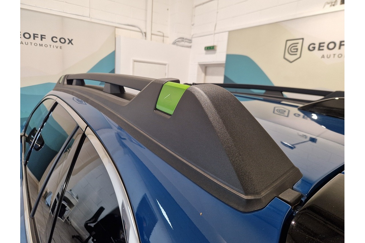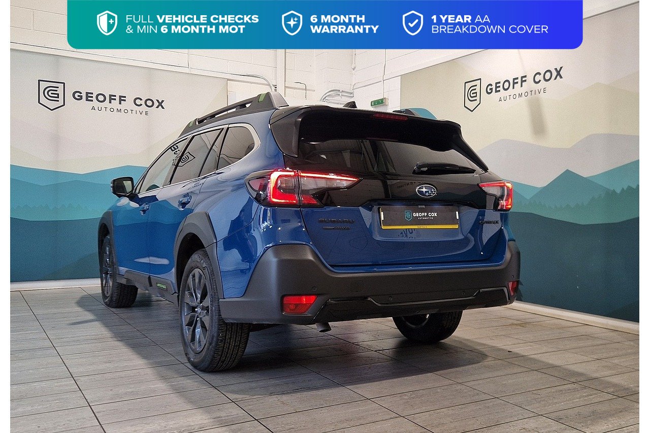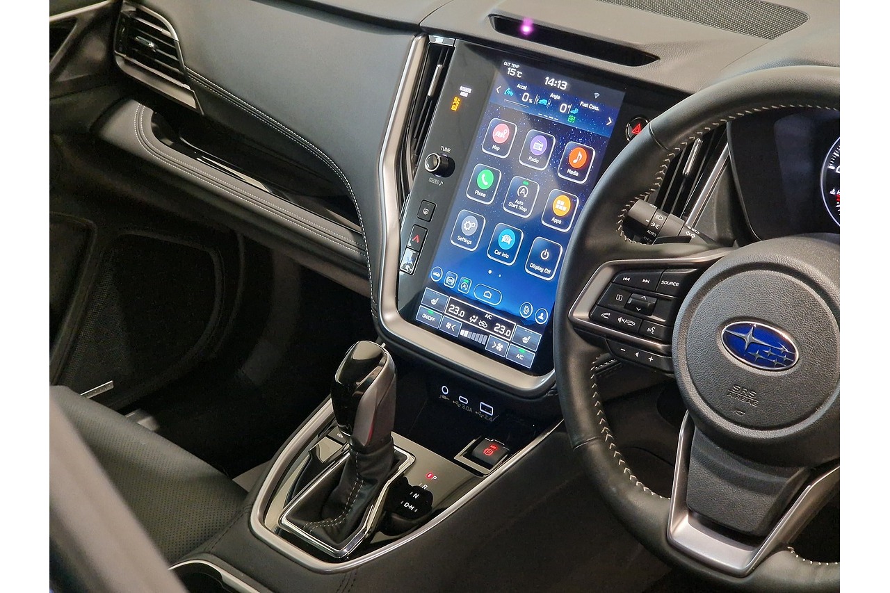 Exterior Design: The vehicle boasts an exclusive Subaru Geyser Blue metallic paint finish, complemented by dark metallic 18-inch alloy wheels, crystal black door mirrors, and black roof rails with increased load capacity. Gloss black accents on the front grille and lower bumpers enhance its robust exterior styling.